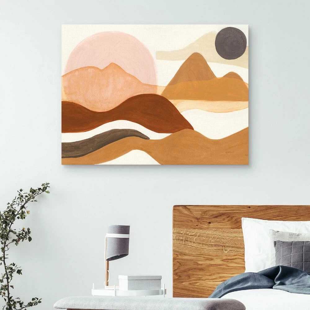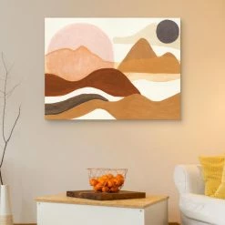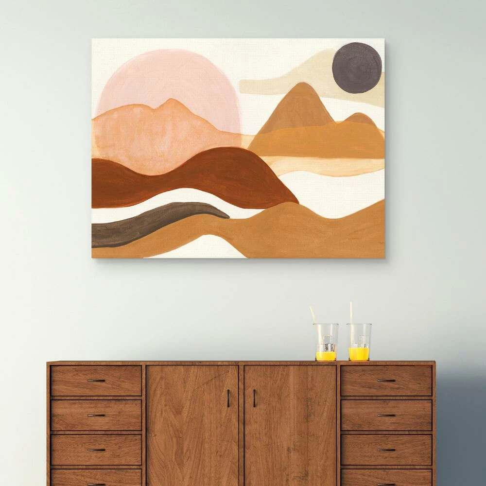 Artist Mary Urban captures a stunning desert sunset in shades of pink, brown and cream in this expansive abstract wall art. This gallery-wrapped canvas wall decor makes a brilliant addition to mid-century and modern home themes.