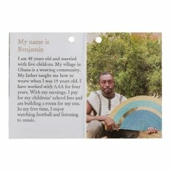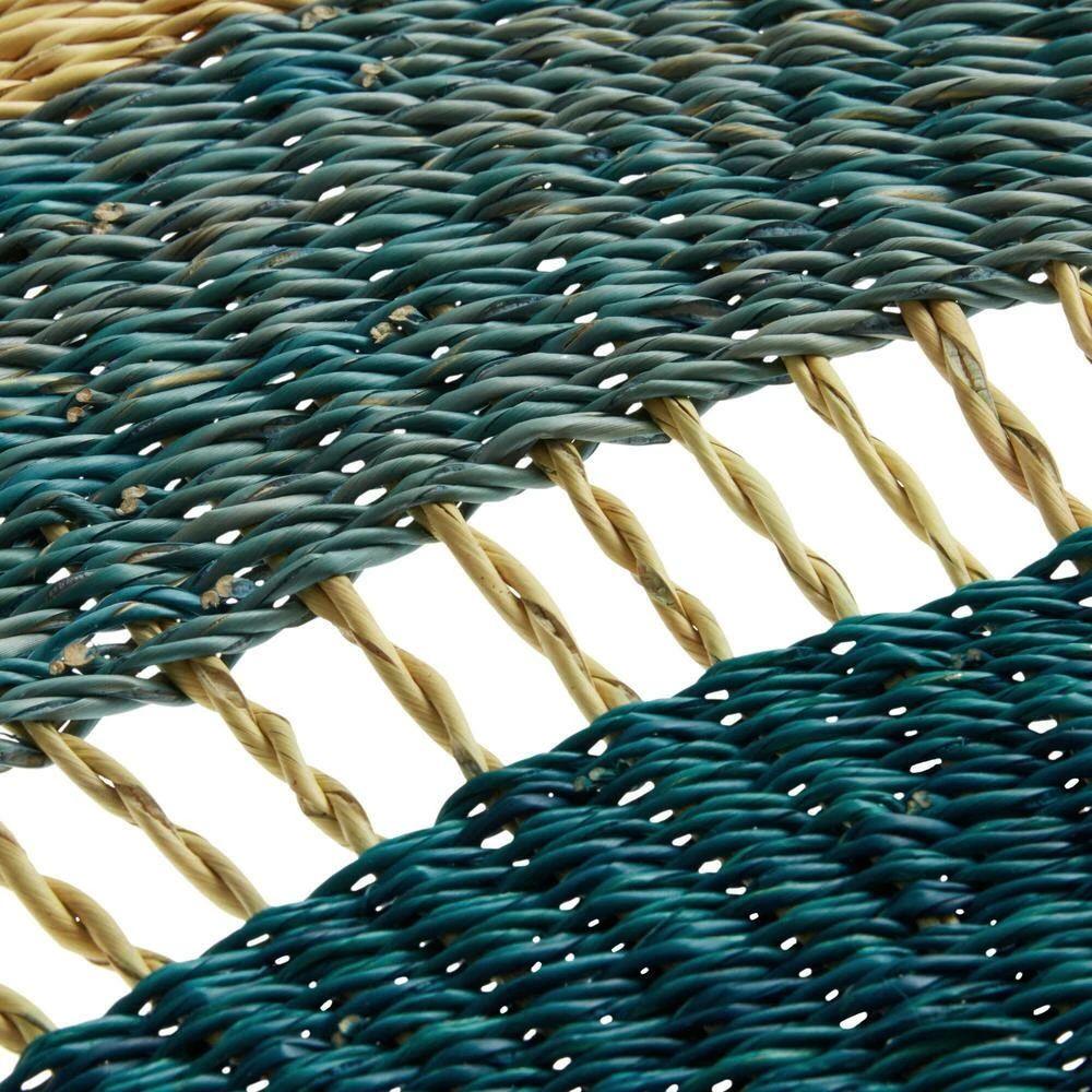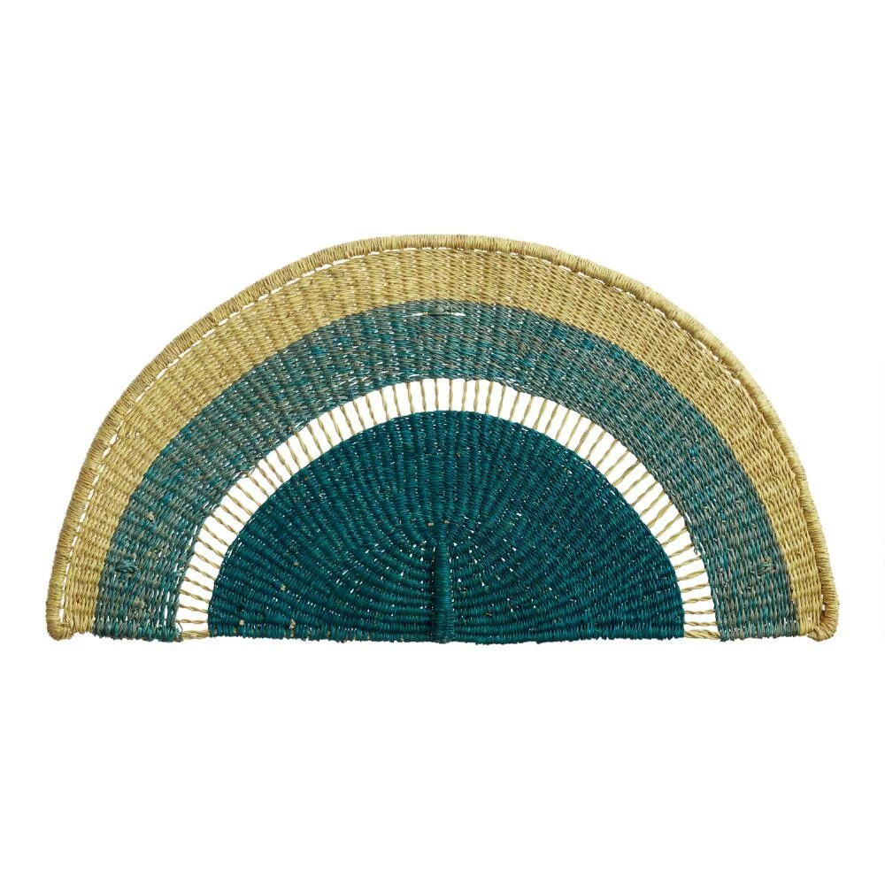 Woven of elephant-grass fibers by artisans in Ghana, this arch wall decor has unique characteristics thanks to the work of each craftsperson. Every navy blue and turquoise semicircle includes a tag describing the weaver and what creating this art means to him or her. In collaboration with All Across Africa, these artisans are empowered to pay school fees, gain access to safe housing, food and healthcare and to save for their future and family.