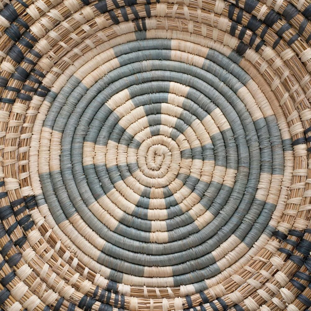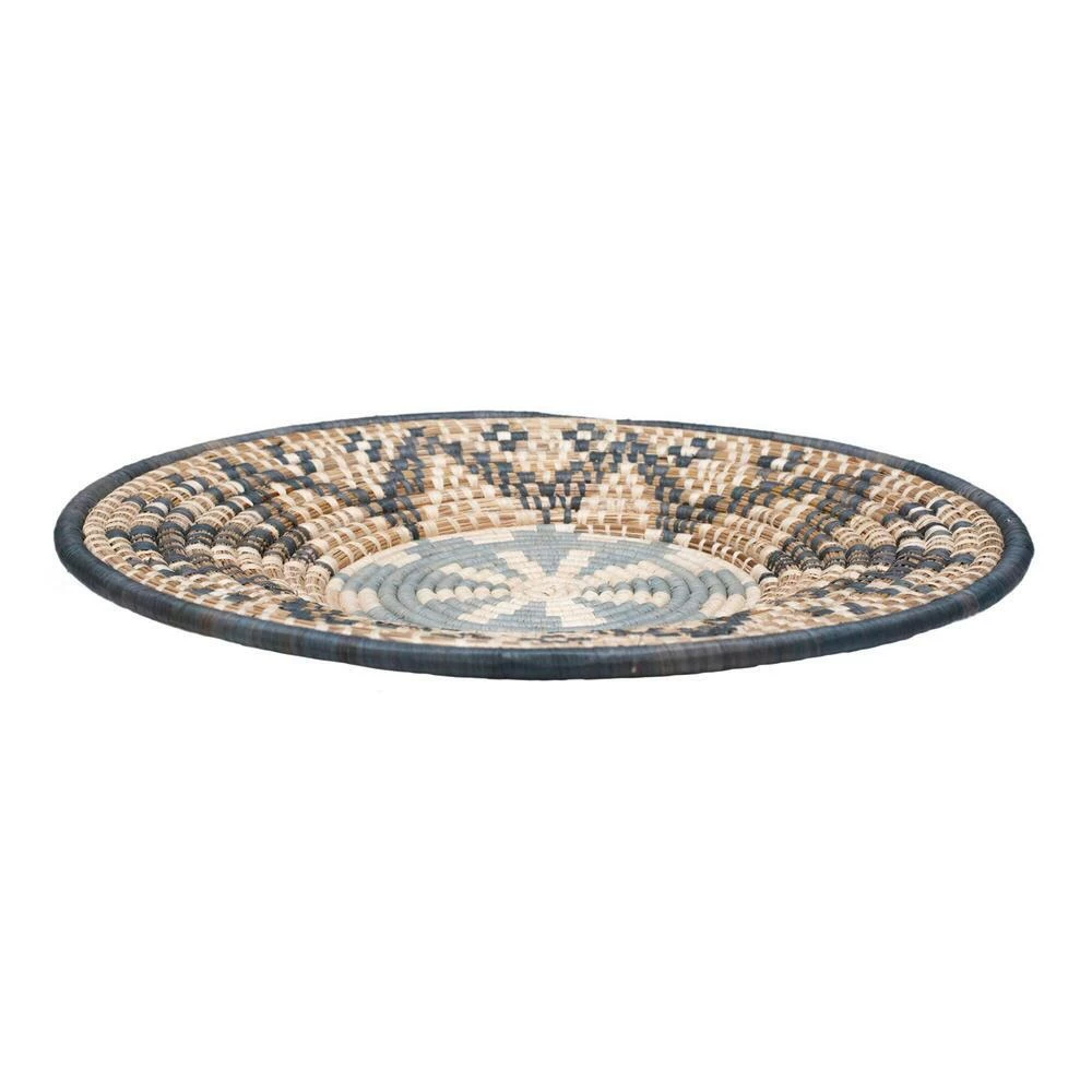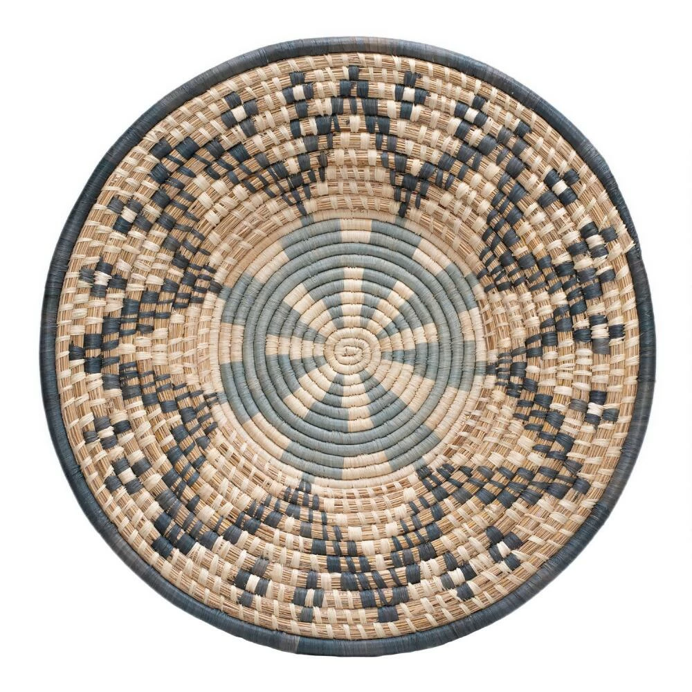 Woven of raffia and banana fibers by artisan women in Uganda, this disc wall decor has unique characteristics thanks to the work of each individual craftsperson. Every blue and ivory piece includes a tag describing the weaver and what creating this art means to her. In collaboration with All Across Africa, these artisans are empowered to pay school fees, gain access to safe housing, food and healthcare and to save for their families.