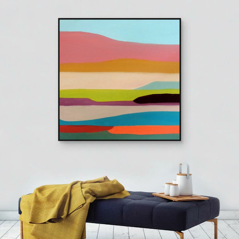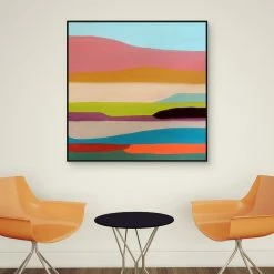 Layers of eye-catching blues, pinks, oranges and greens create a colorful abstraction on this framed canvas wall art. Based out of Montreal, Sylvie Demers’ paintings express her optimism and spontaneity, instantly enhancing any art collection. Framed in hand-stained black wood, we adore the vibrant yet serene quality this abstract wall decor brings to any room.