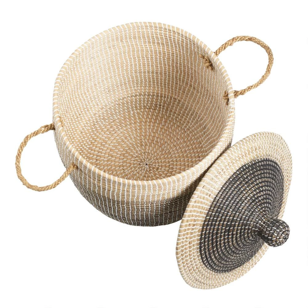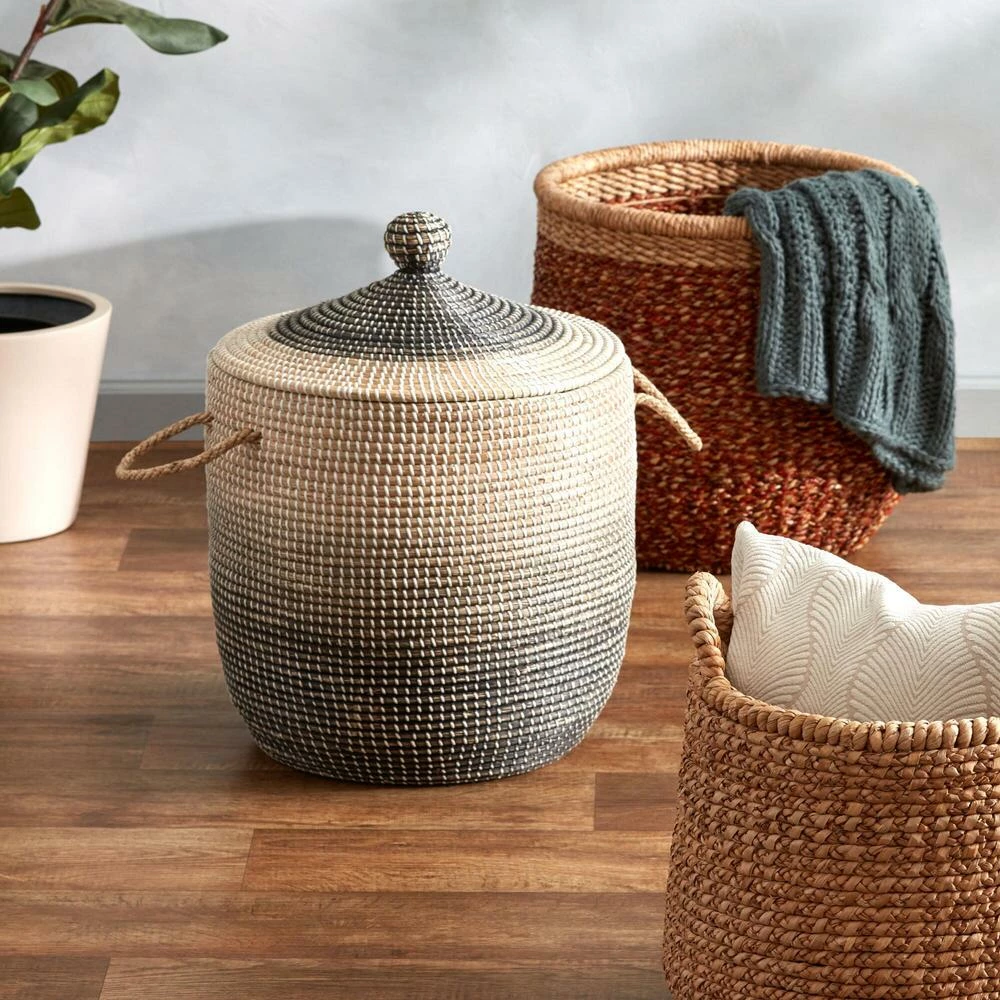 On-trend in ombre, our Amelia basket features sturdy handles for easy toting and a snug lid for tidy storage. This chic piece is handcrafted by artisans in Vietnam, who weave natural seagrass with white recycled plastic before applying a tonal black finish.
