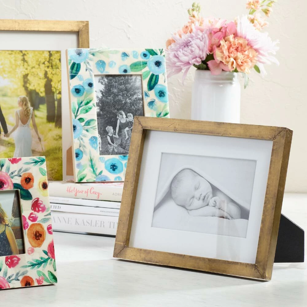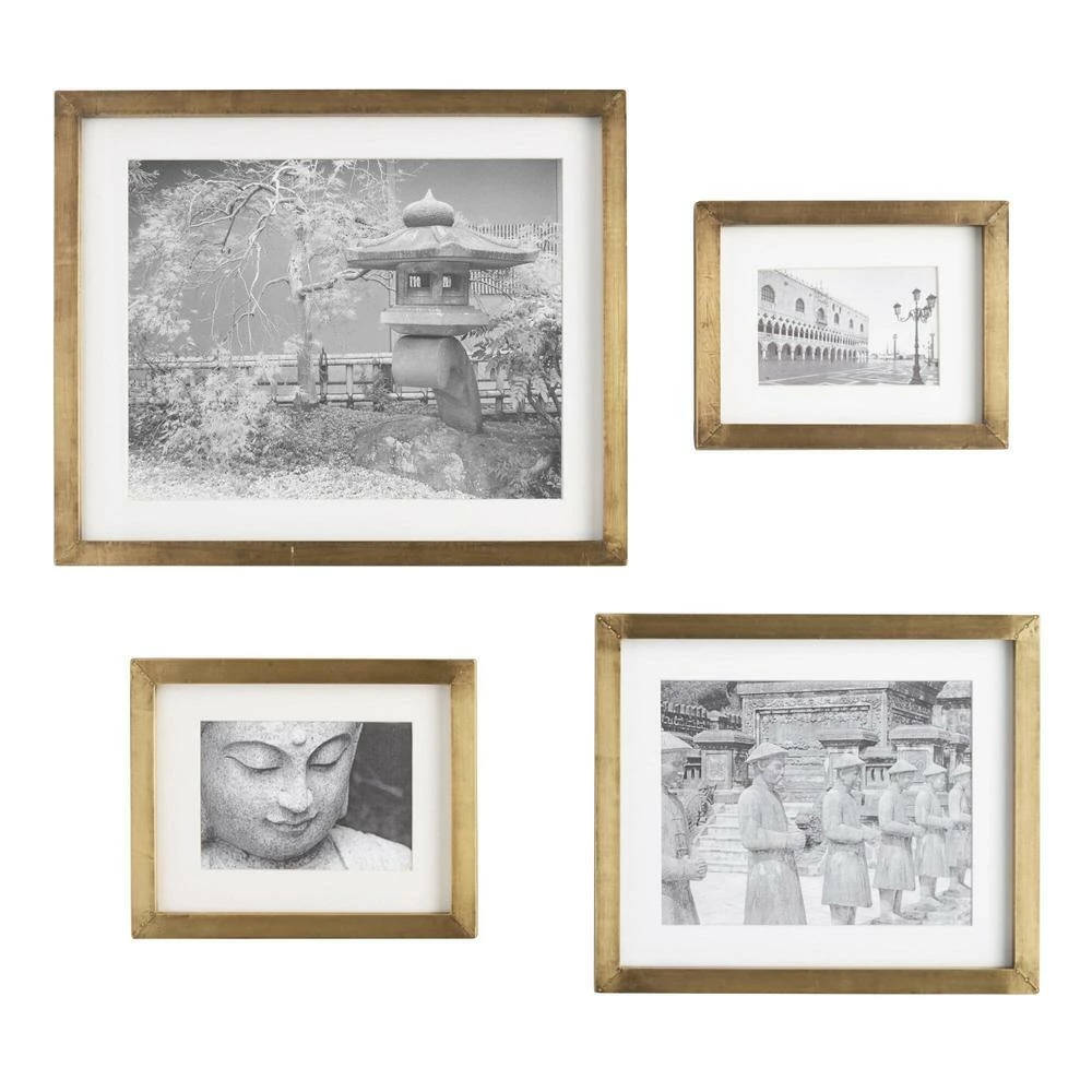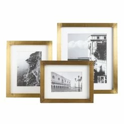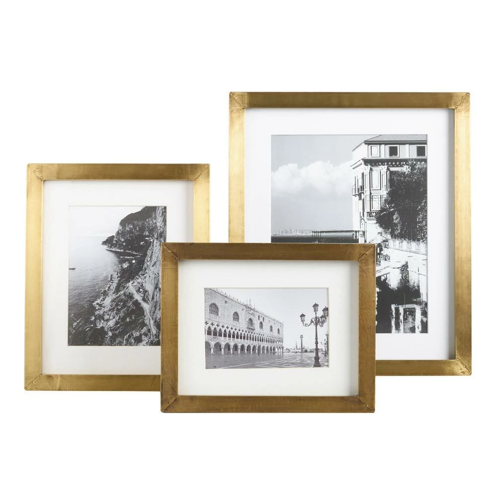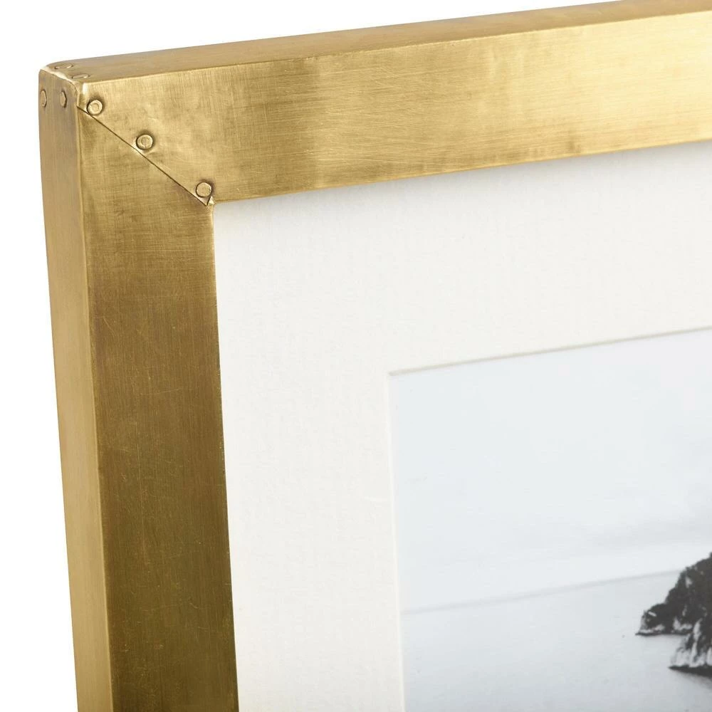 Create an eye-catching photo collage with our contemporary wall frames in multiple sizes. A versatile addition to existing frame collections, each frame features white matting and antique brass metal-clad borders with nail accents.