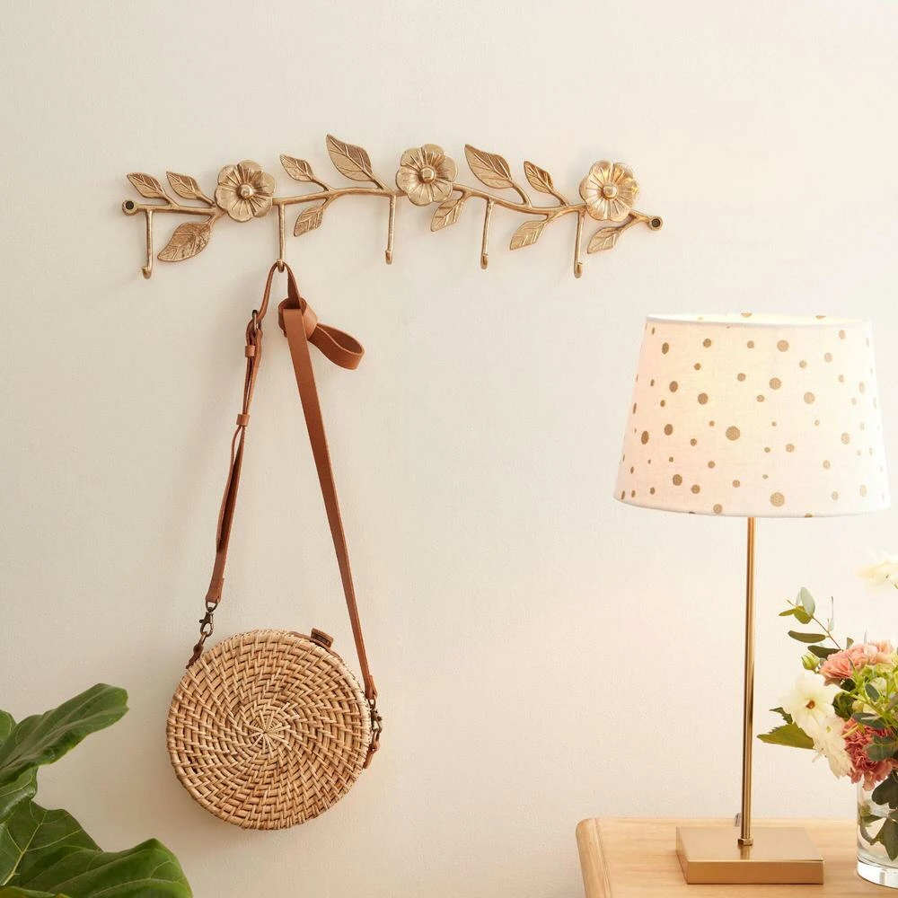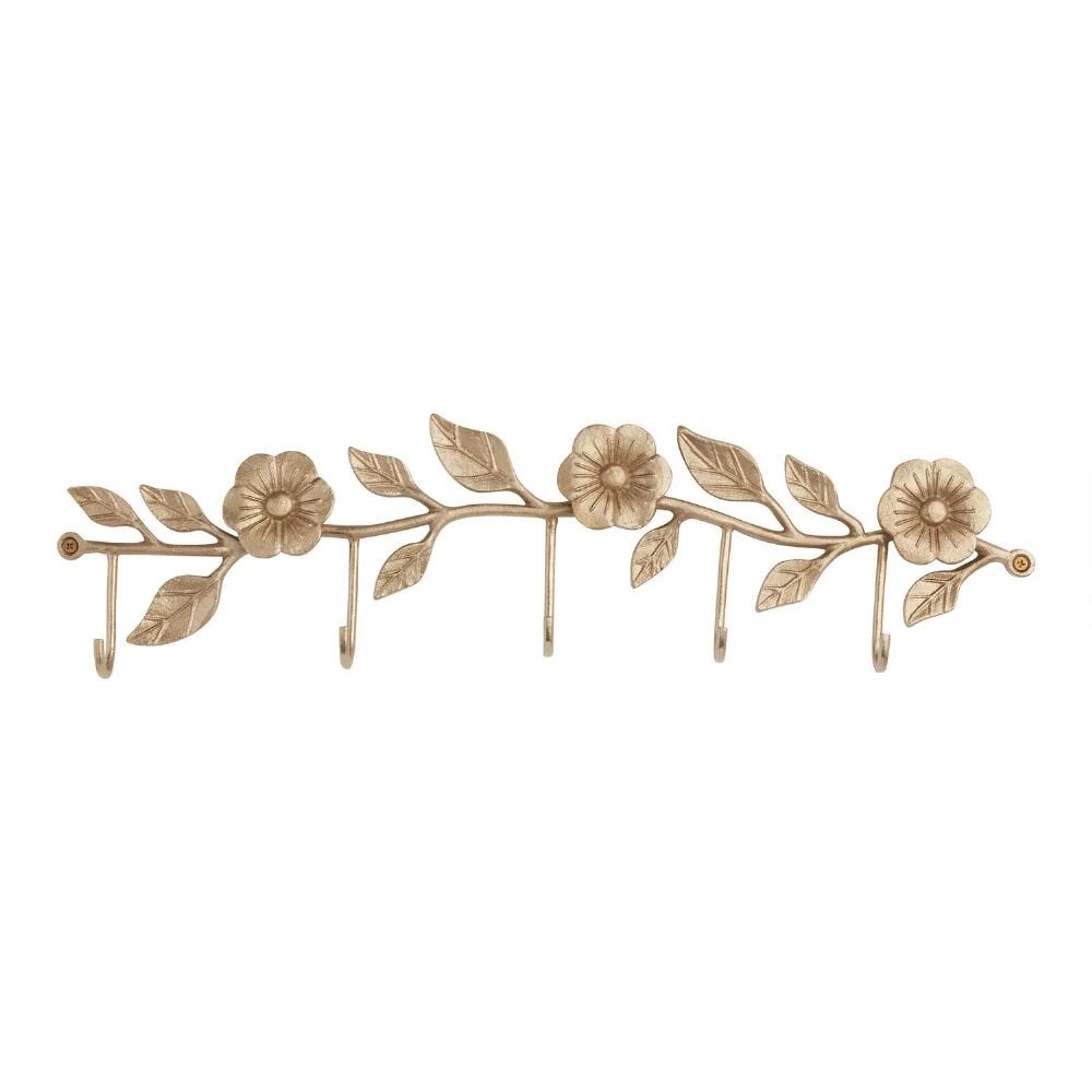 Our exclusive wall rack combines beauty and function with a striking antique-gold floral motif and five storage hooks. The perfect entryway piece, it’s ideal for keeping everyday items like keys, coats and hats stylishly organized and off the floor.