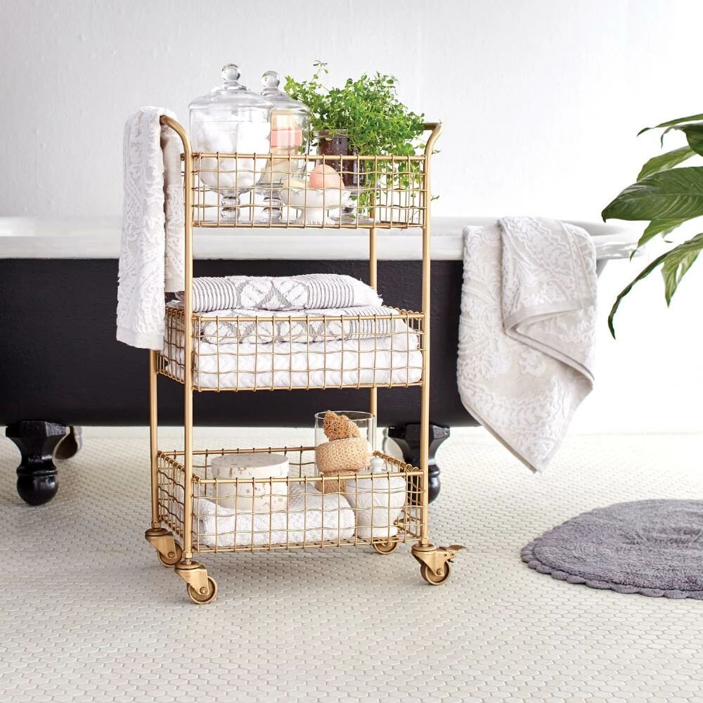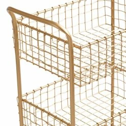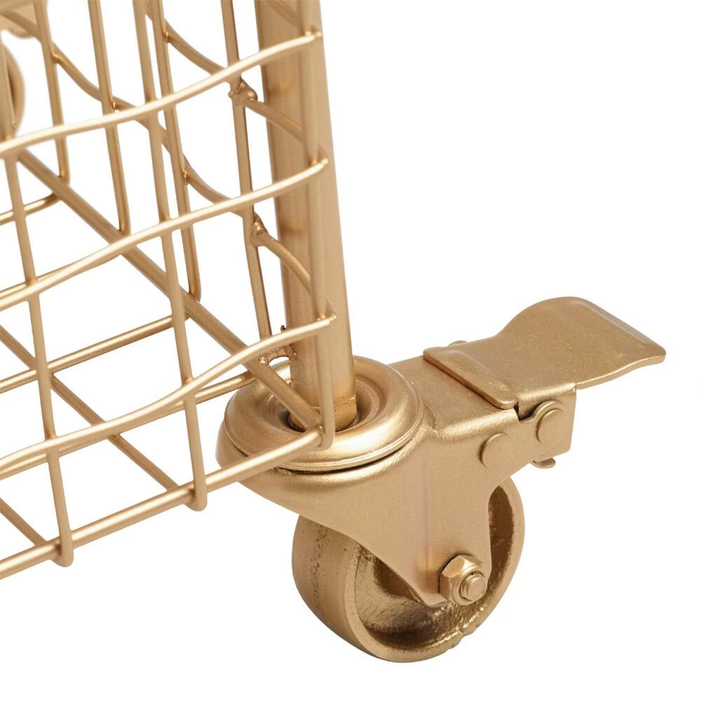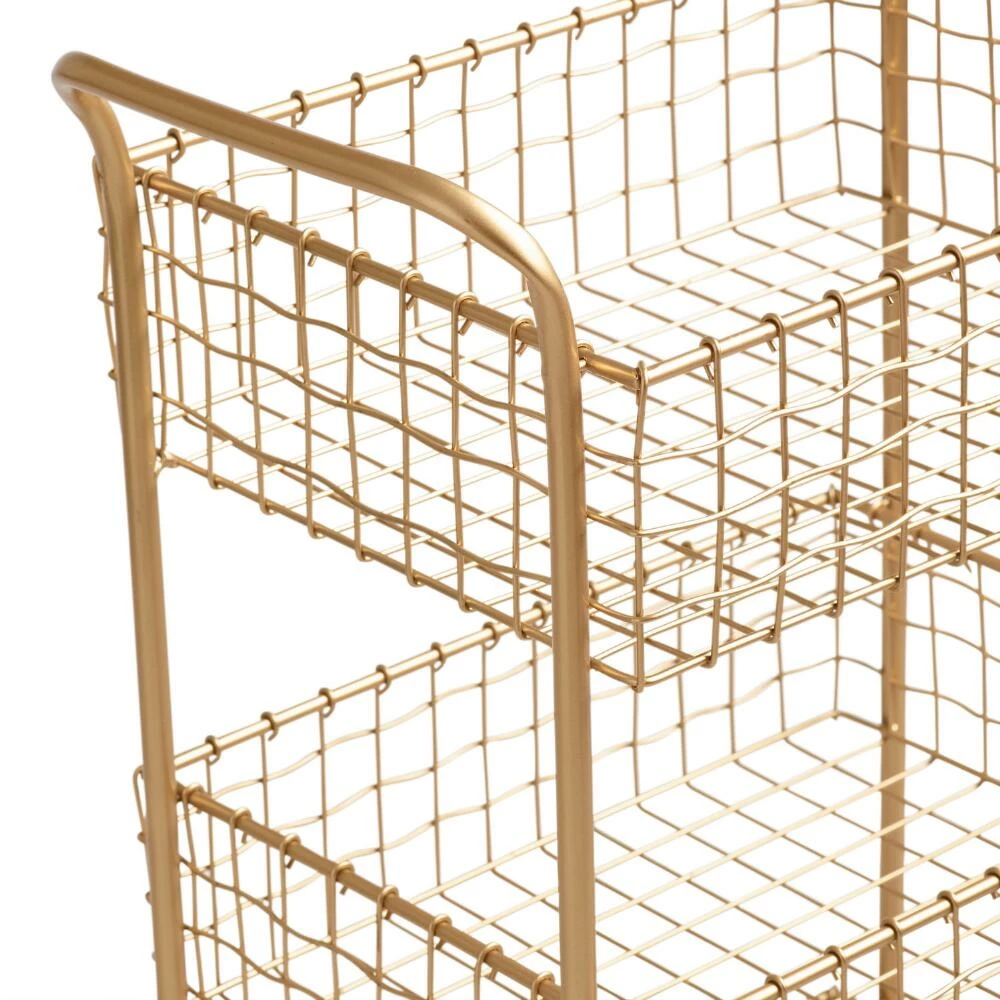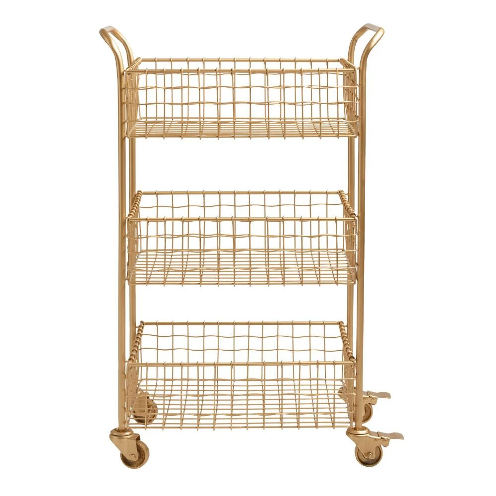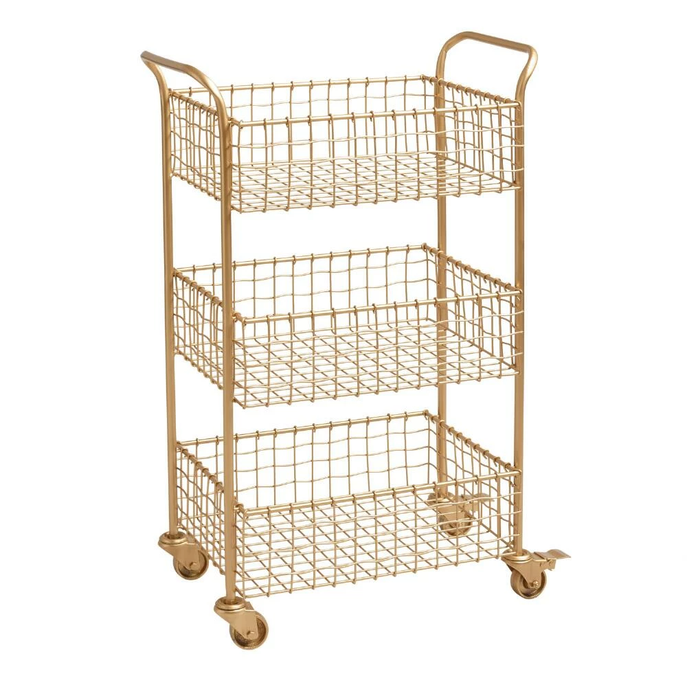 With a brushed-gold finish and a slightly wavy weave, our metal rolling cart lends effortless glamour to any workspace. Three deep basket-style tiers and locking casters give this sophisticated piece substance to match its style.
