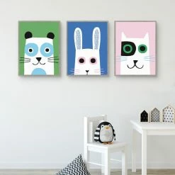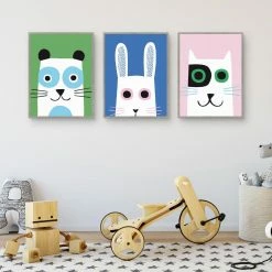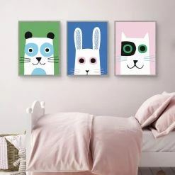 An extraordinary addition to your little one’s room, this three-piece set inspires imaginative play with its bear, bunny and cat portraits. They delight with bold green, blue and pink tones mixed with black and white and are complete with hand-stained gray wood frames. The playful and colorful universe Sophie Ledesma creates in her art can be seen in advertising campaigns, poster and card collections and children’s books.