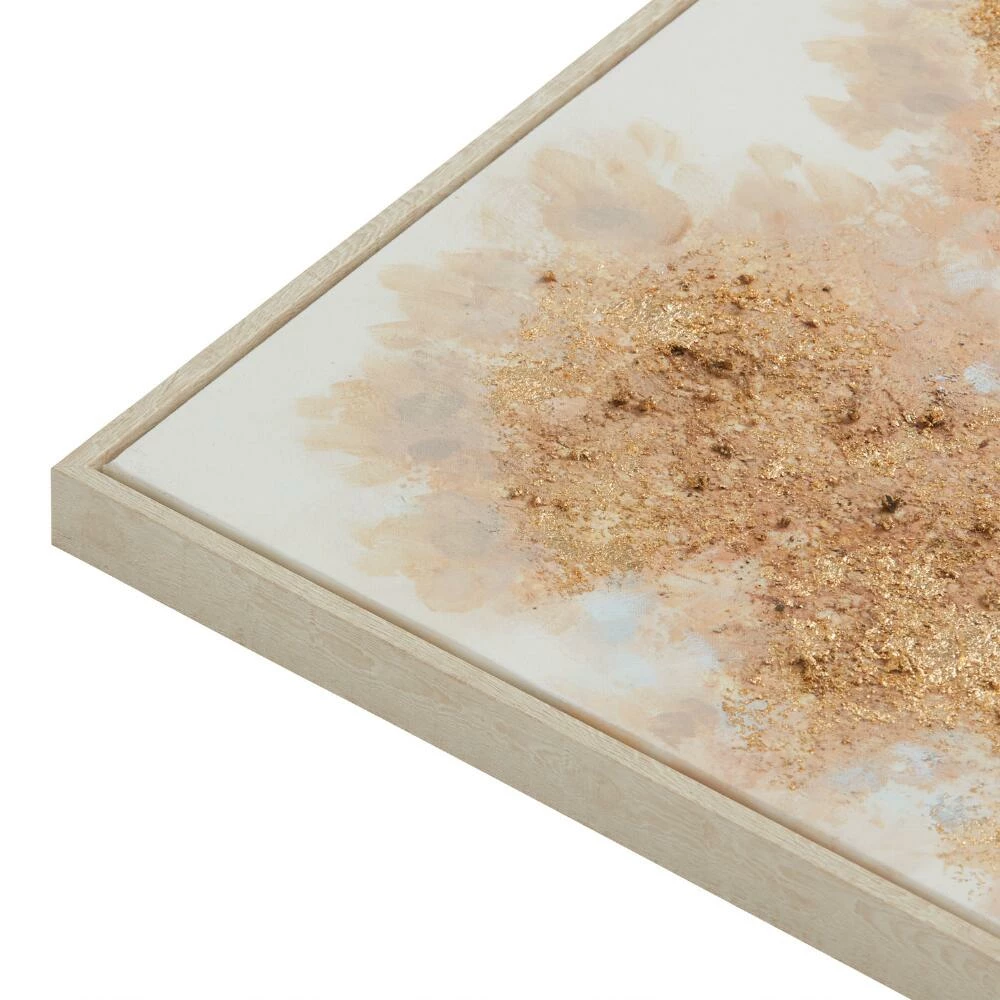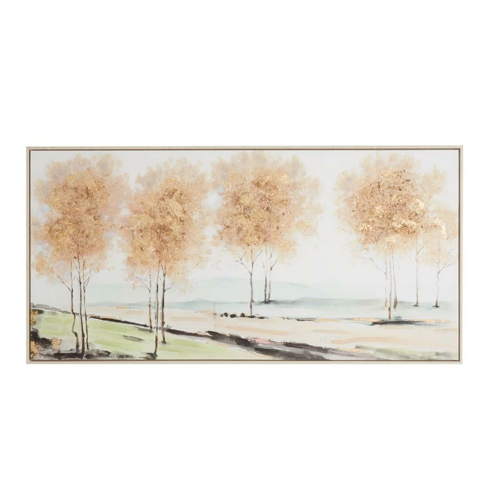An abstract landscape of birch trees with gleaming gold leaves draws attention in this ready-to-hang work of art. This striking piece gets its wealth of texture from embellishments painted by hand. Surrounded by a whitewashed frame, this oversized painting is gorgeous over a sofa.