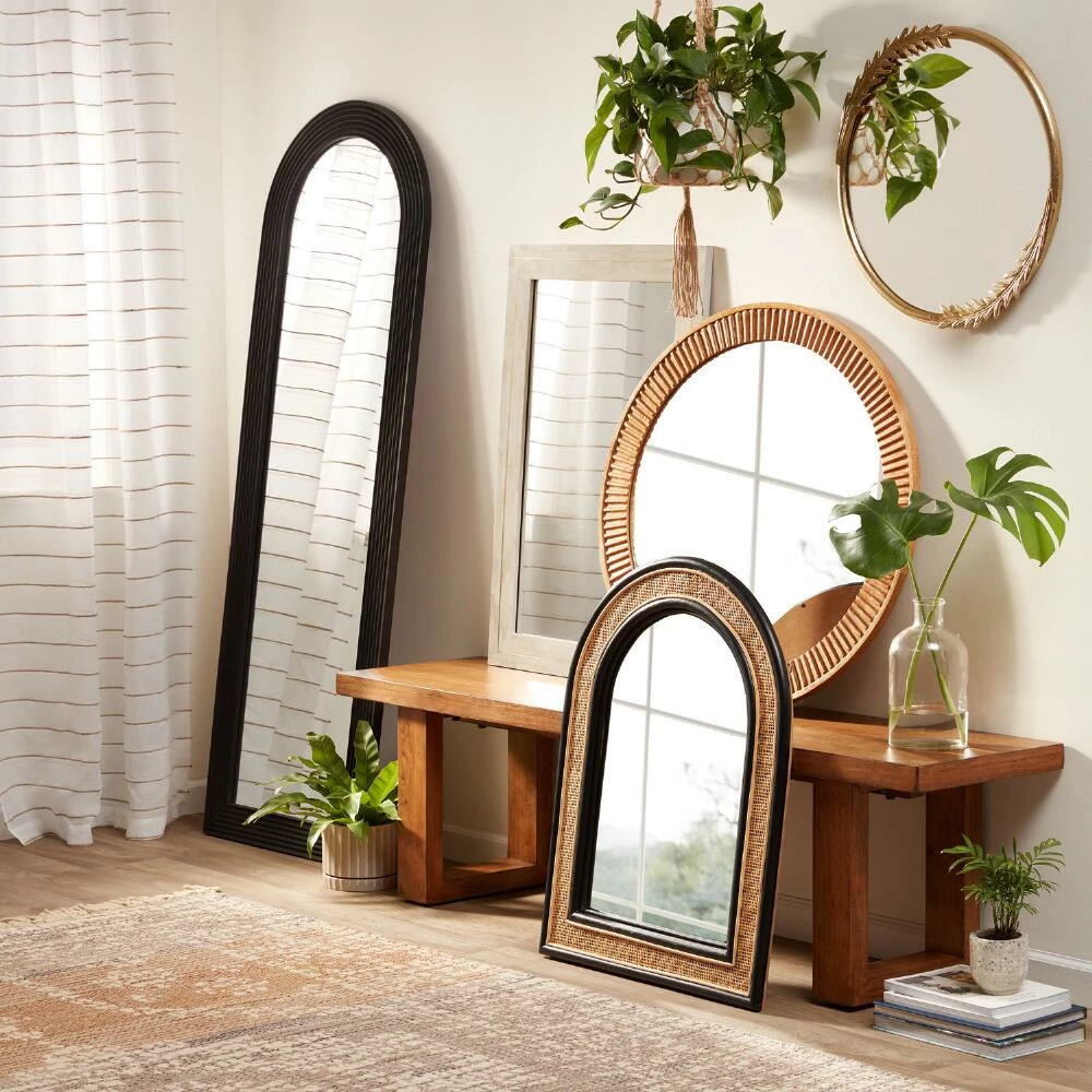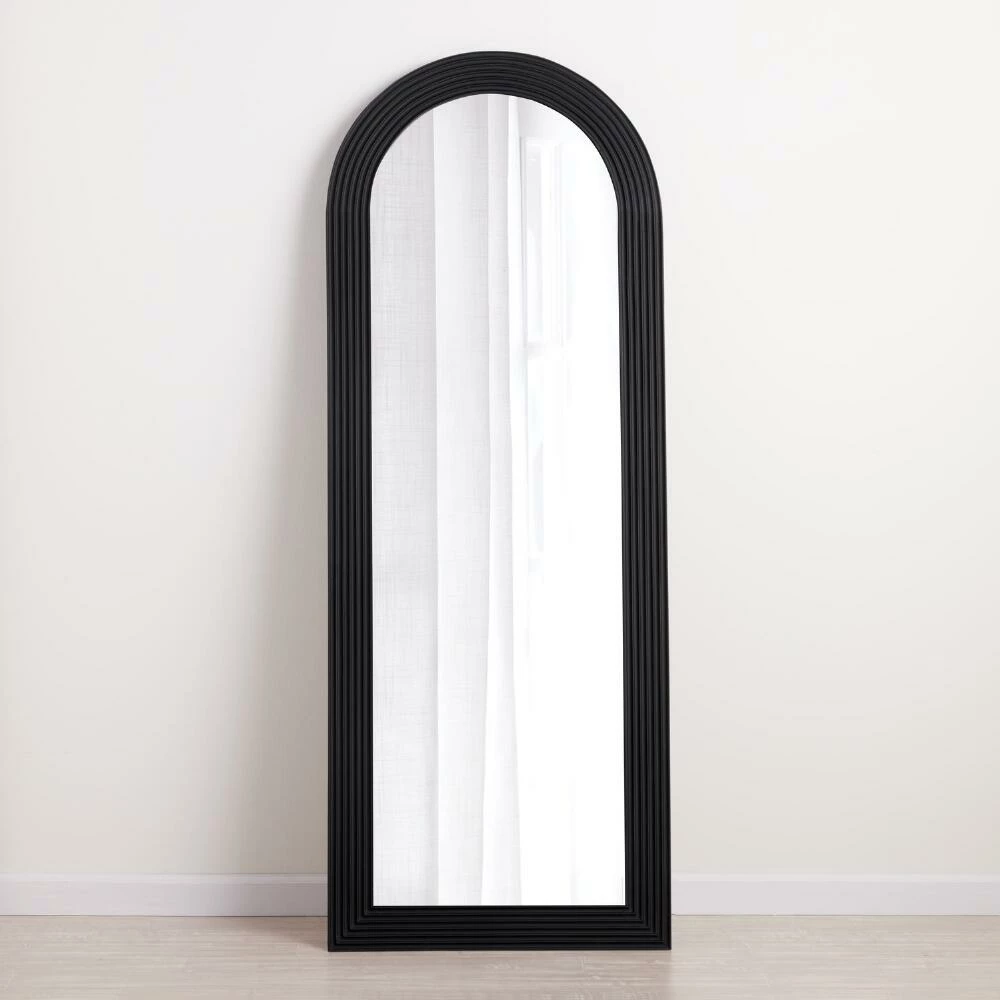 From Saharanpur, India, our floor mirror is handcrafted of mango wood in an on-trend arch shape and carved with ridges for added dimension. An increasingly rare craft, the skill and technique required to create this work of art takes years to learn and is only preserved by the passing down of knowledge through generations of family artisans. This versatile full-length mirror makes a contemporary statement in the bedroom or living room.