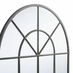 Panes of mirrored glass are framed in black hand-embossed metal to give our large arched mirror an architecturally pleasing windowpane effect. Whether displayed in an entryway, bedroom or living room, it instantly opens up a space with reflective light and artisan appeal.