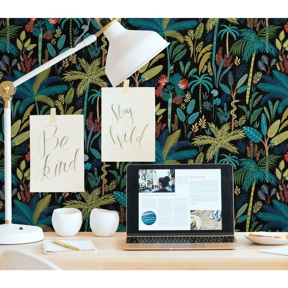 In a nighttime-inspired palette featuring vibrant blues and greens against a black backdrop, this easy DIY wallpaper adds the lush beauty of a tropical forest to any space. Simply peel off the backing, stick your new wallpaper to a smooth surface and readjust until it’s exactly where you want it. With a strong, self-adhesive design that won’t leave a sticky residue, it’s an effortless way to transform any wall, backsplash or piece of furniture.