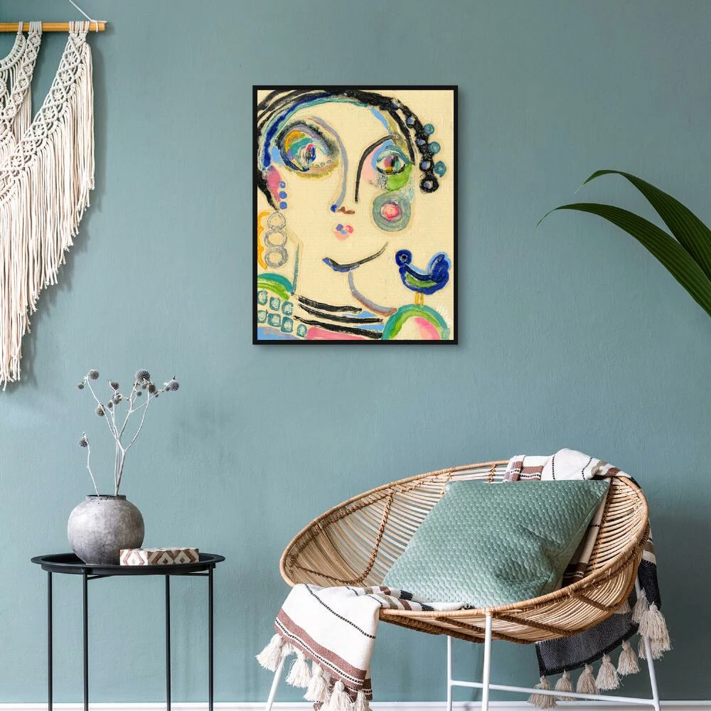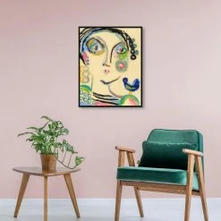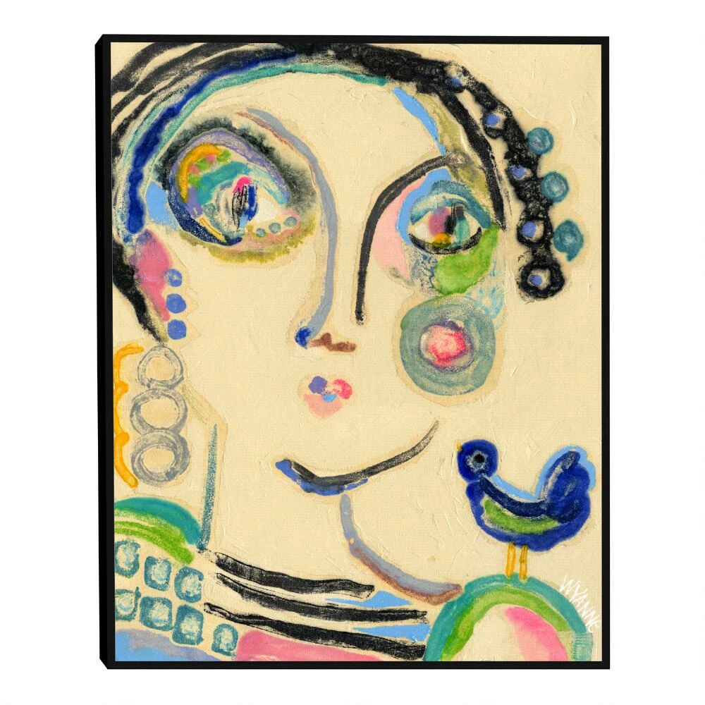 Rich blue and black strokes create an abstract portrait of a bluebird perched on a feminine figure in this framed canvas wall art by Wyanne. After being diagnosed with stage IV cancer in 2013, the Atlanta-based artist says the experience taught her not to take anything for granted. She makes the most of each moment by painting full time nearly every day.