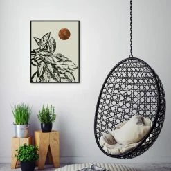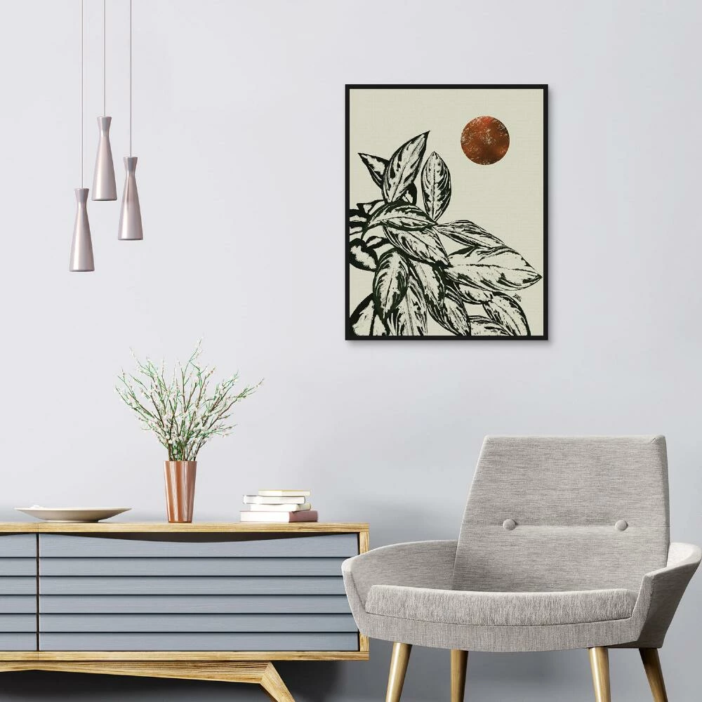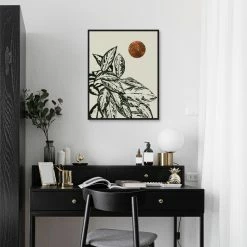 Bring botanical beauty and celestial dazzle to your room with Bria Nicole’s dreamy wall art, depicting graceful, green-edged leaves under a bronze moon. Drawing inspiration from interior design, fashion and styles from all over the world, the illustrator creates boho-inflected works of art that elevate any living space. With a creamy natural background and a classic black frame, this piece hangs handsomely alongside almost any decor.
