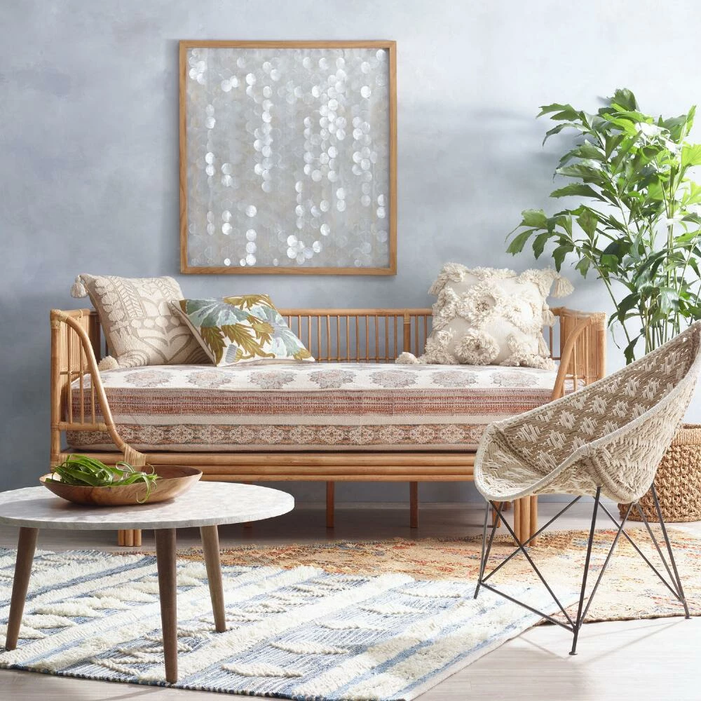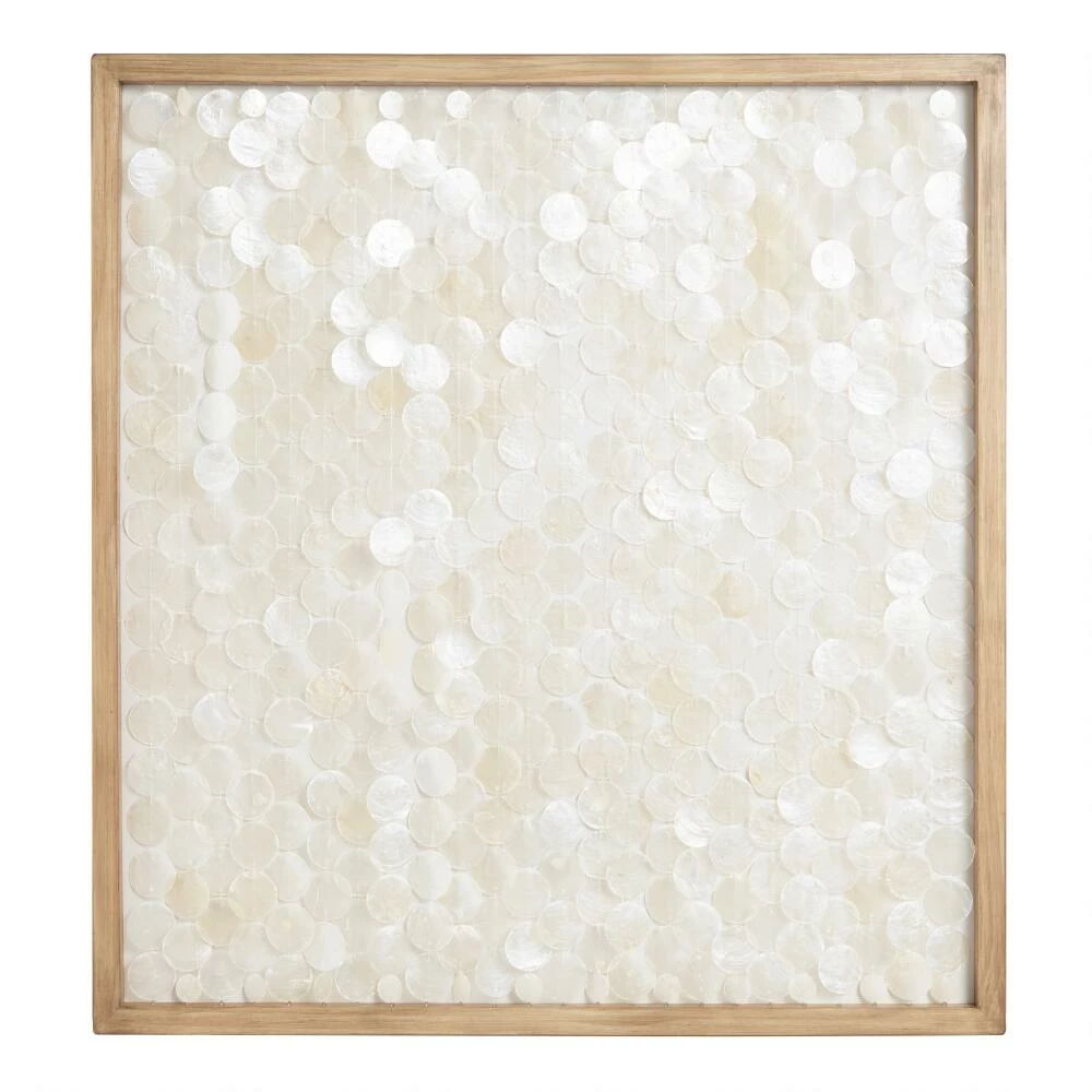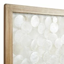 Columns of iridescent capiz shells strung from a pine wood frame with graywash finish imbue this large tropical wall art with island influence. Crafted by artisans in the Philippines, this wall decor conveys a sense of movement while beautifully catching the light.