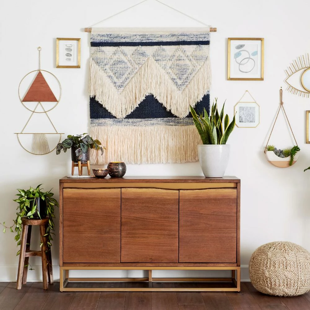 Add some artistic expression to your room with our exclusive, contemporary wall hanging. This dimensional wall decor is made from milled steel with a gold finish and acacia wood with a walnut finish. The delicately constructed and linked metal shapes are grounded by the rich, warm tones of the wood for an overall modern-abstract mobile effect.