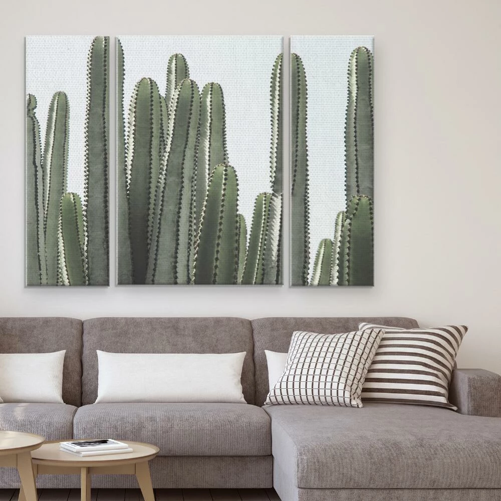 Our photographic canvas wall art triptych imbues any room with cool desert vibes. Depicting a prickly cluster of cacti standing tall across three gallery-wrapped canvases, this contemporary wall decor set blooms with Southwestern style.