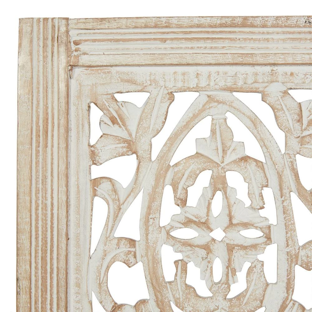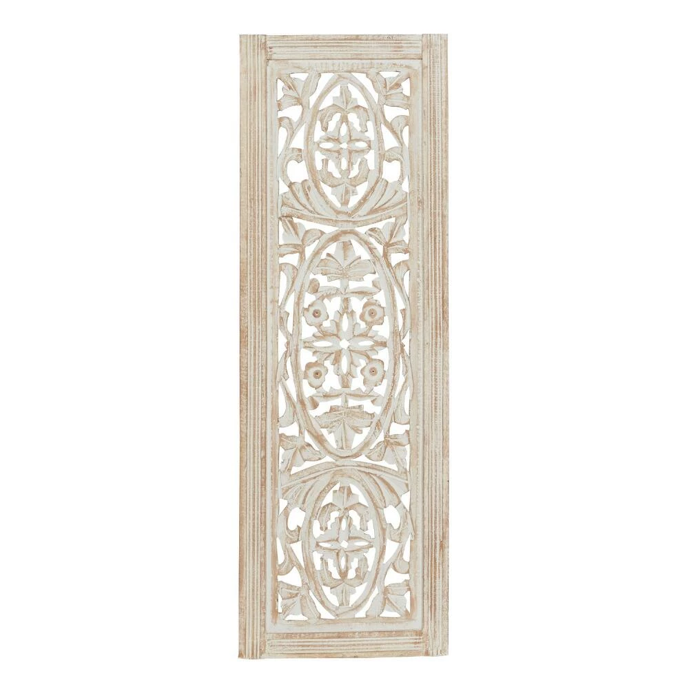 An intricately carved scroll design and distressed finish give this mango-wood panel wall decor its sculptural elegance. A versatile statement piece for a range of decor styles, this dimensional wall art is gorgeous displayed above a sofa, bed or in an entryway.