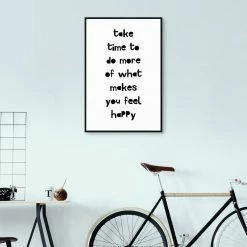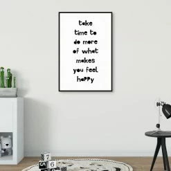 Create a cheerful environment with this quality canvas art print. It showcases the words “Take time to do more of what makes you feel happy” in playful hand-lettered text on a white ground framed in complementary black wood. Whether your happiness comes from pampering self-care or a daring adventure, this friendly reminder adds encouragement to any wall in your home.