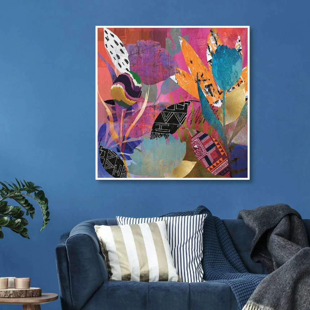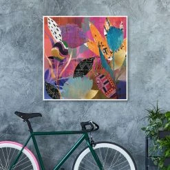 A riot of colorful blooms with metallic-gold and geometric-patterned leaves delights the eye in this abstract floral wall art by Nikki Chu. With a design philosophy grounded in architectural aesthetics and global influences, the famed celebrity designer creates affordable luxury pieces for modern homes. This white wood-framed piece brings a welcome pop of color and contemporary style to any wall.