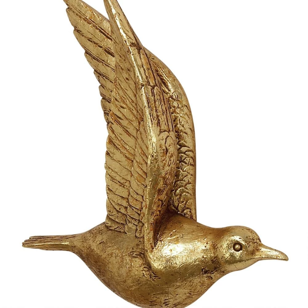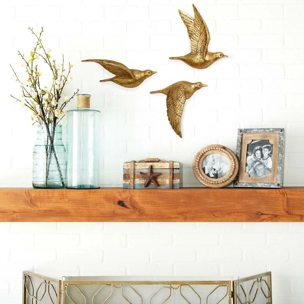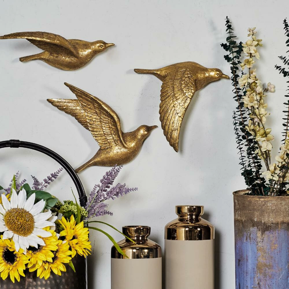 Beautify your space with these three lustrous birds in flight, a sculptural take on wall decor. Made of lightweight yet durable polystone and finished in glittering gold, this 3D bird wall art set can be displayed in a host of arrangements to best suit your space.