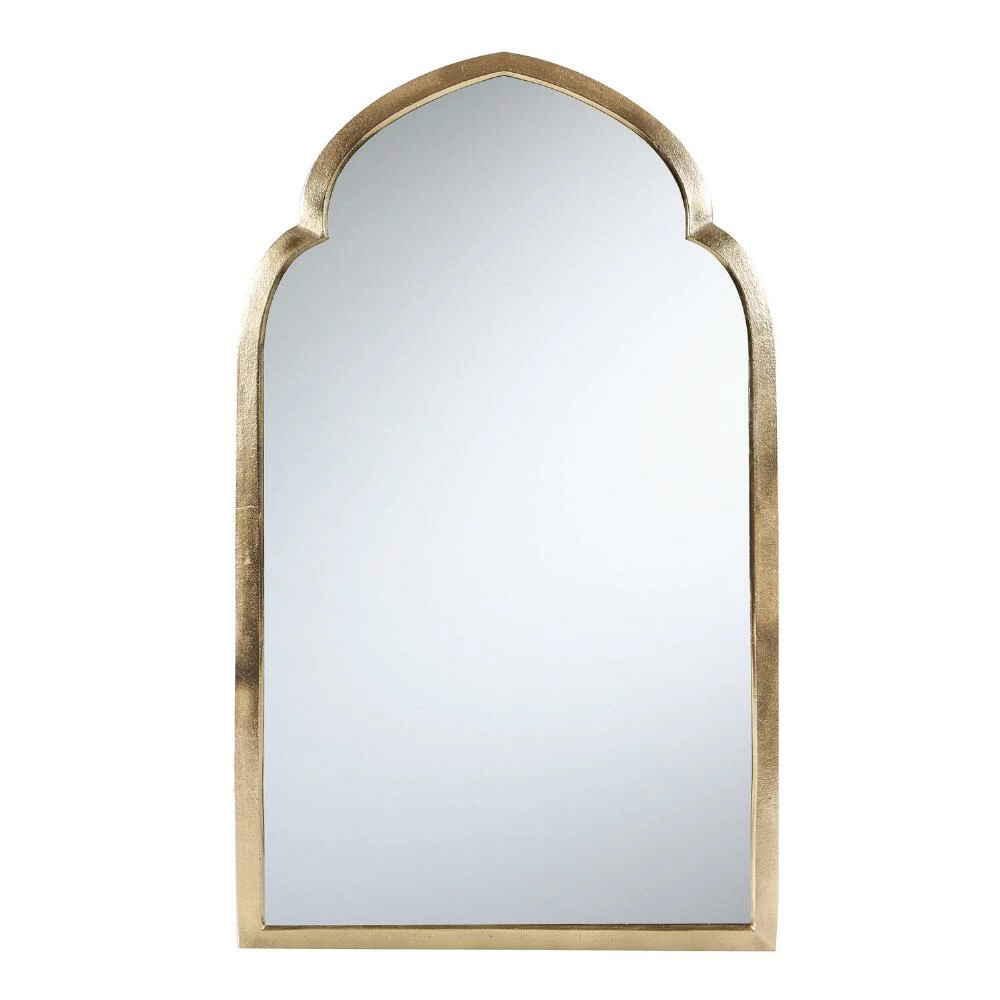 An architectural take on a classic decor piece, our Mehrab wall mirror is crafted in India with an arched silhouette inspired by centuries-old Islamic design. Finished in glistening gold, its naturally reflective properties create a room-enlarging effect whether hung above a vanity, nightstand or entryway table.