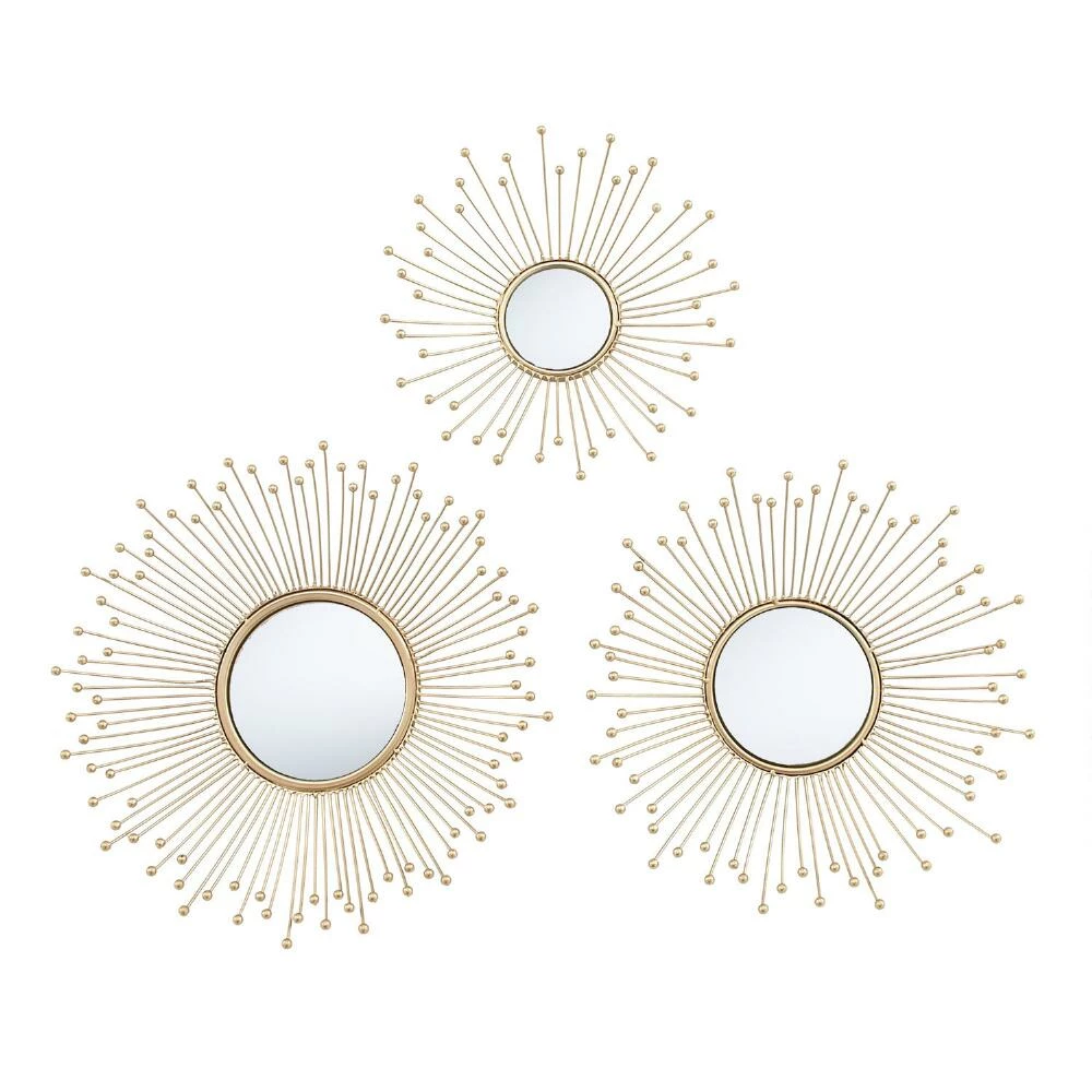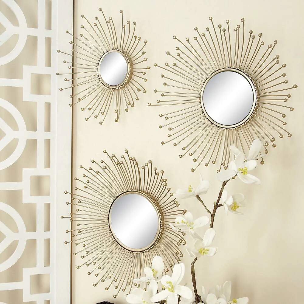 Enliven a room by creating a striking wall display with our set of three sunburst mirrors. In three sizes, each is framed with thin gold rays of alternating lengths for a distinctly mid-century-modern appeal.
