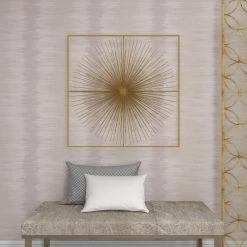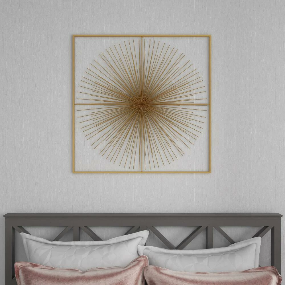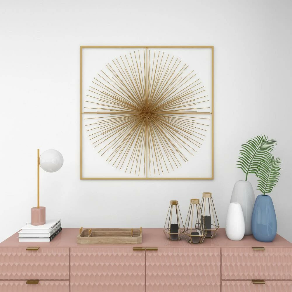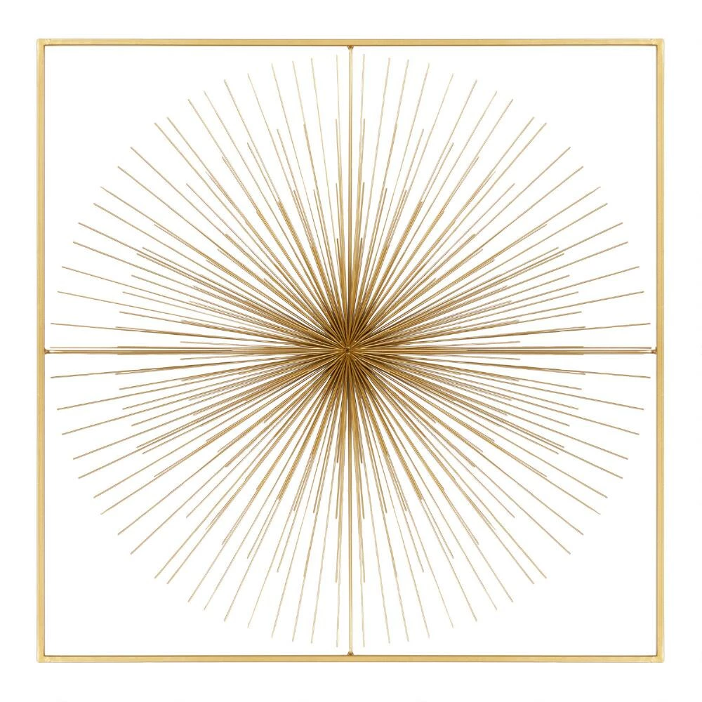 Our glamorous metallic-gold framed wall decor adds instant star power wherever it hangs. Handcrafted by artisans in India for unique character, this large wall art showcases a round starburst with shimmering spokes that radiate from the center set inside a modern square frame.