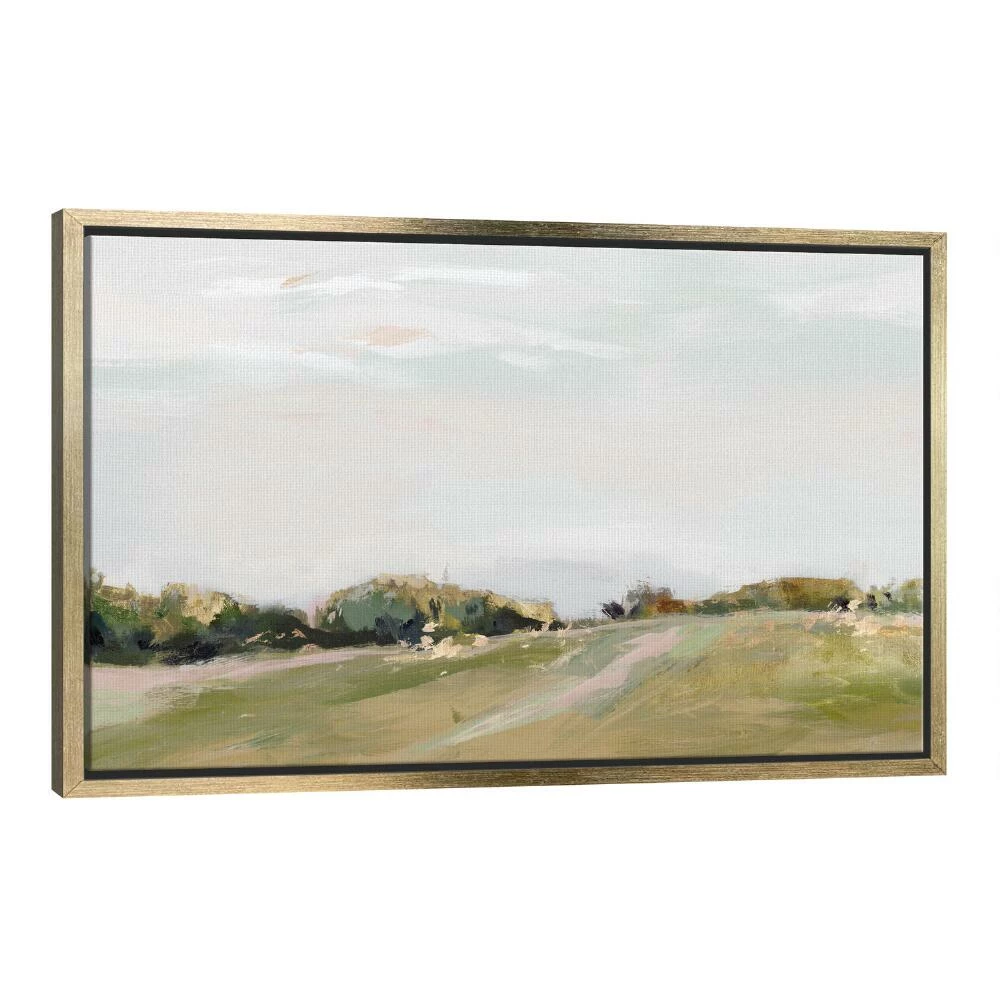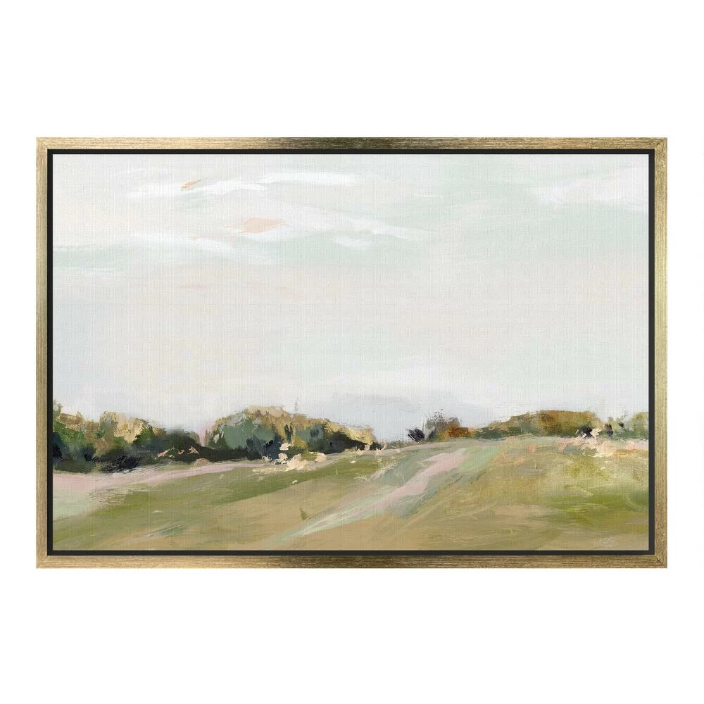 A bucolic landscape of calm tranquility soothes the eye on this framed canvas wall art. Raised in a small town in New York, artist Isabelle Z. now lives in California, where she creates moving modern art with classic techniques. Finished with a floating wooden frame painted gold, this scenic landscape wall decor lends a peaceful vibe to any room.
