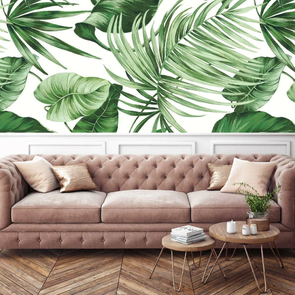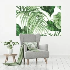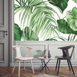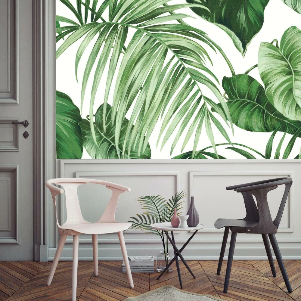 Transform your space with our wallpaper wall mural featuring a green tropical leaf motif against a white backdrop. Easy to position and reposition during installation, it’s a bold way to easily refresh a room with a relaxed, island-inspired vibe.