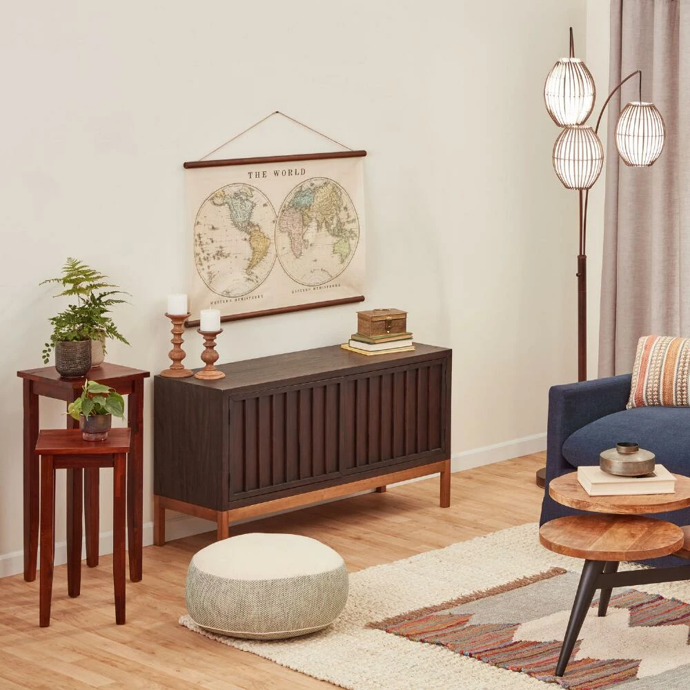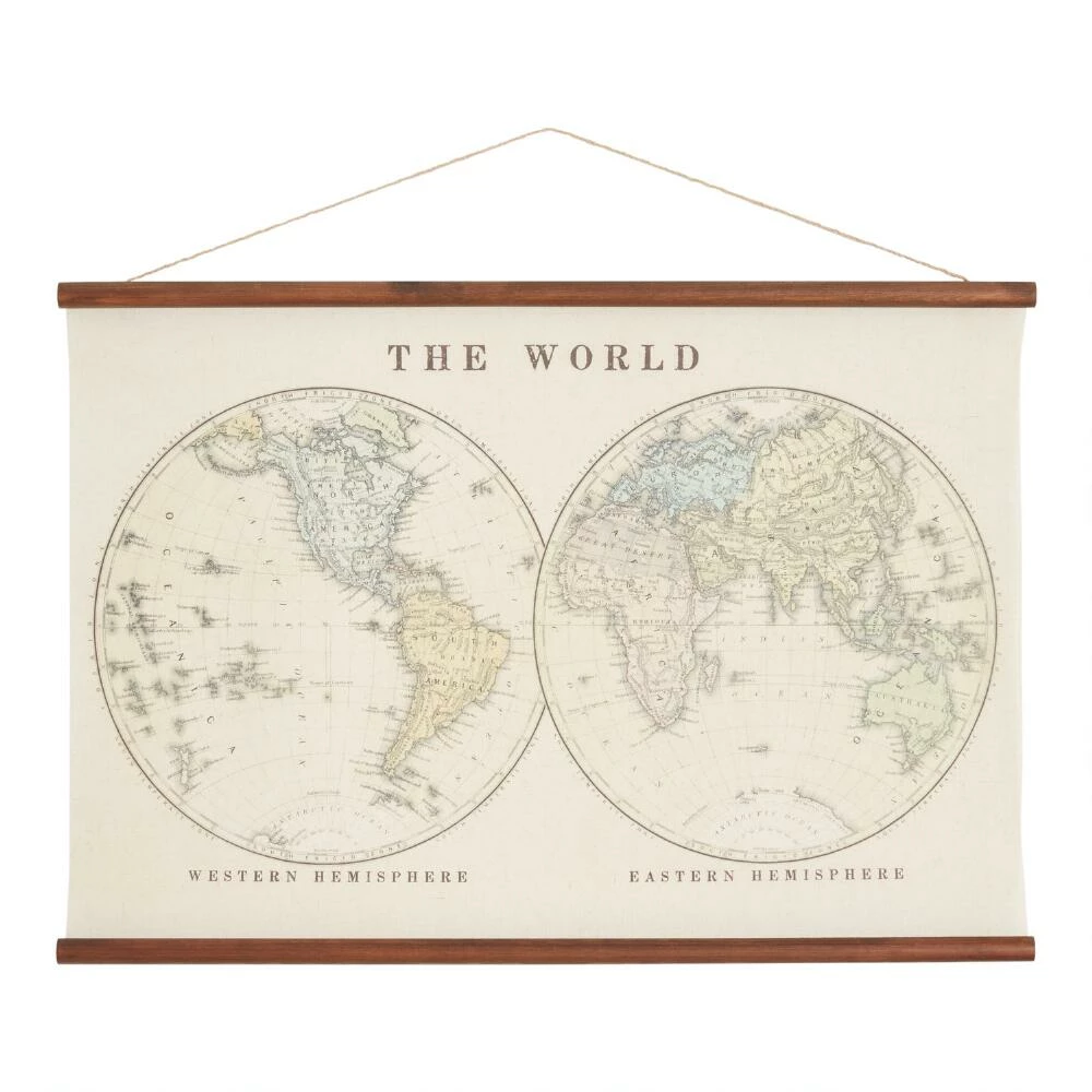 Add a dashing vintage vibe to any room in your home with our exclusive world map wall decor. Full of antique character, its display of the eastern and western hemispheres lends a unique view of the planet. This rustic scroll wall hanging is printed on linen canvas and stretched between natural-wood dowels.