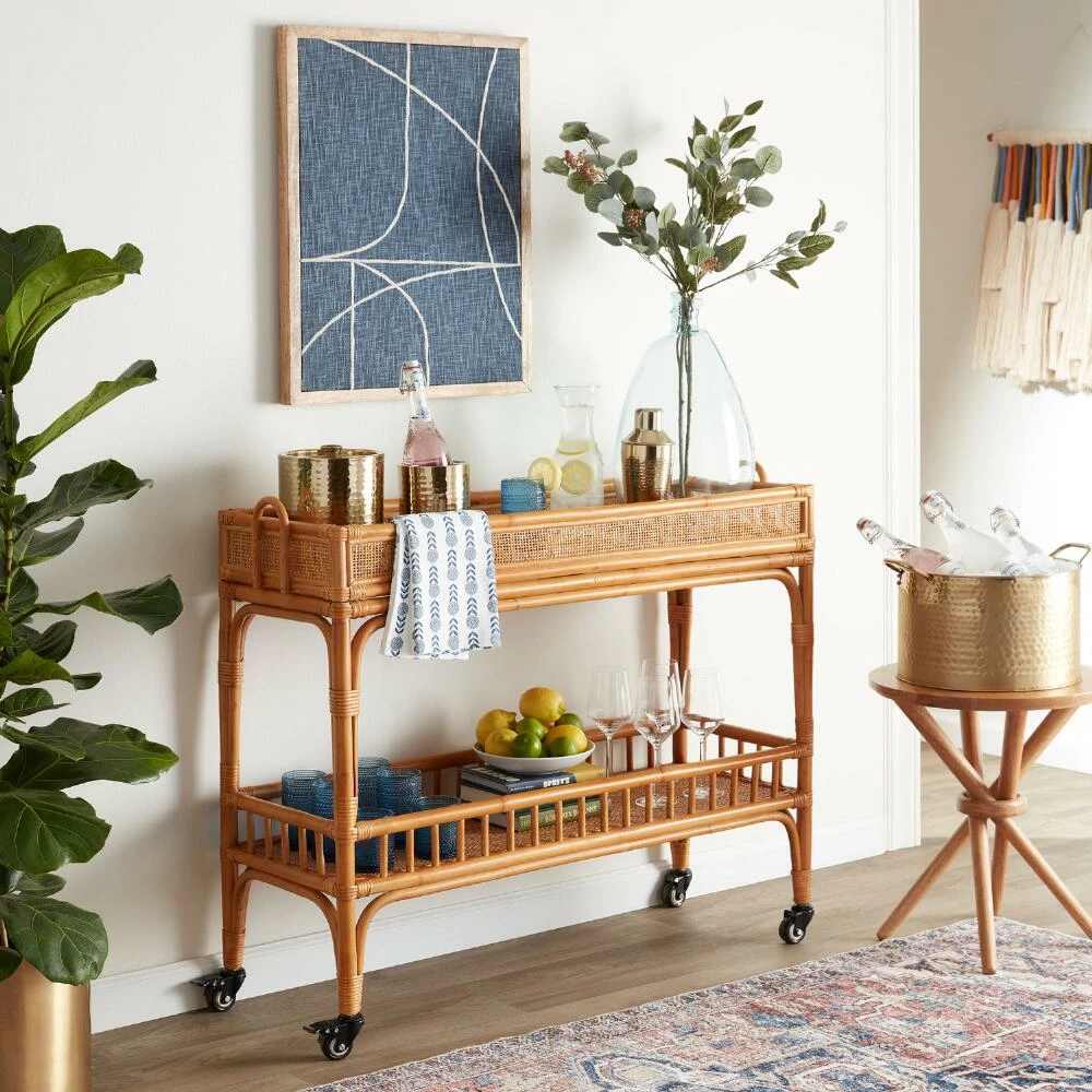 - Handcrafted of cotton and polyester in mango wood frame with natural finish