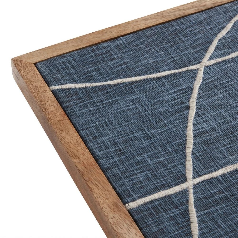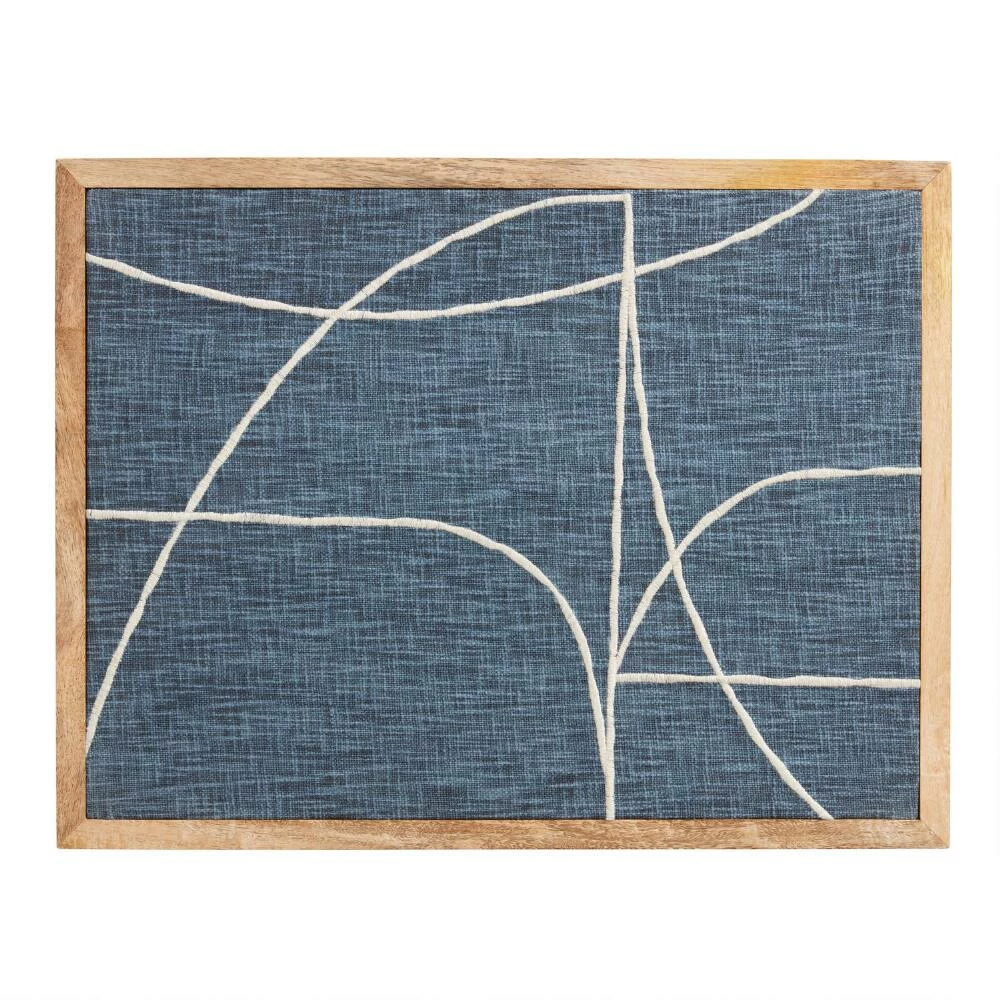A mix of textures and colors gives our wall art its standout appeal. Handmade by artisans in India, this piece features sculptural white lines on an indigo blue cotton slub backdrop. Framed in mango wood, this ready-to-hang piece is an artful addition to boho, mid-century and contemporary spaces.