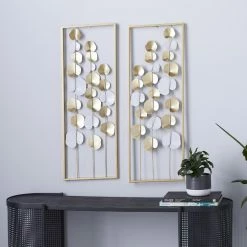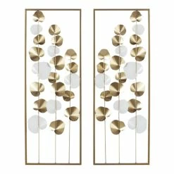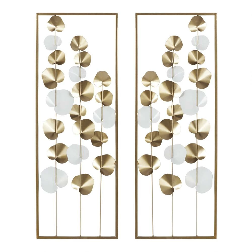 Our mirror-image metal leaf wall decor panels take their cue from the beauty found in nature. Glossy white and metallic-gold leaves are artfully arranged on long stems for an organic aesthetic and are set inside a rectangular frame for a modern decor finish.