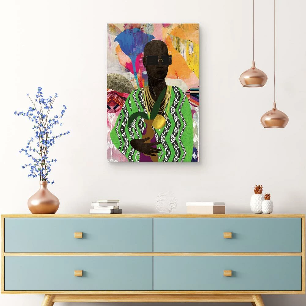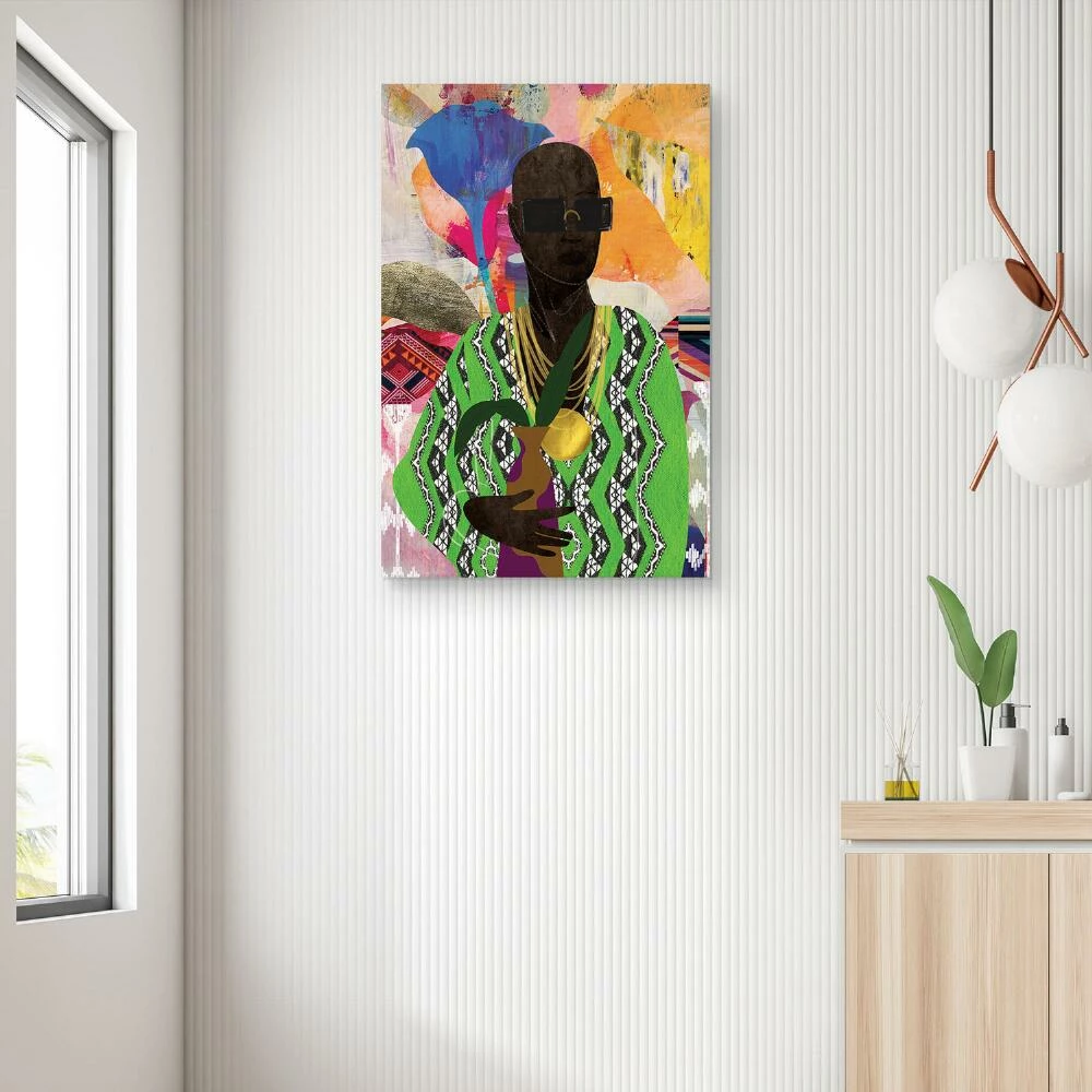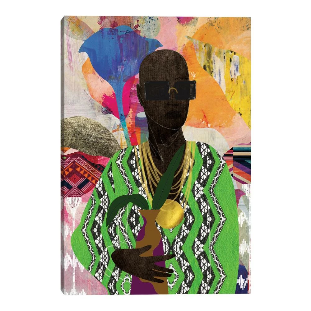 A striking Black man is complemented by expressive colors, rich patterns, eye-popping eyewear and a large avian creature in this electric piece by Nikki Chu. With a design philosophy grounded in architectural aesthetics and global influences, the famed celebrity designer creates affordable luxury pieces for modern homes. This handcrafted canvas infuses any room with powerful energy.
