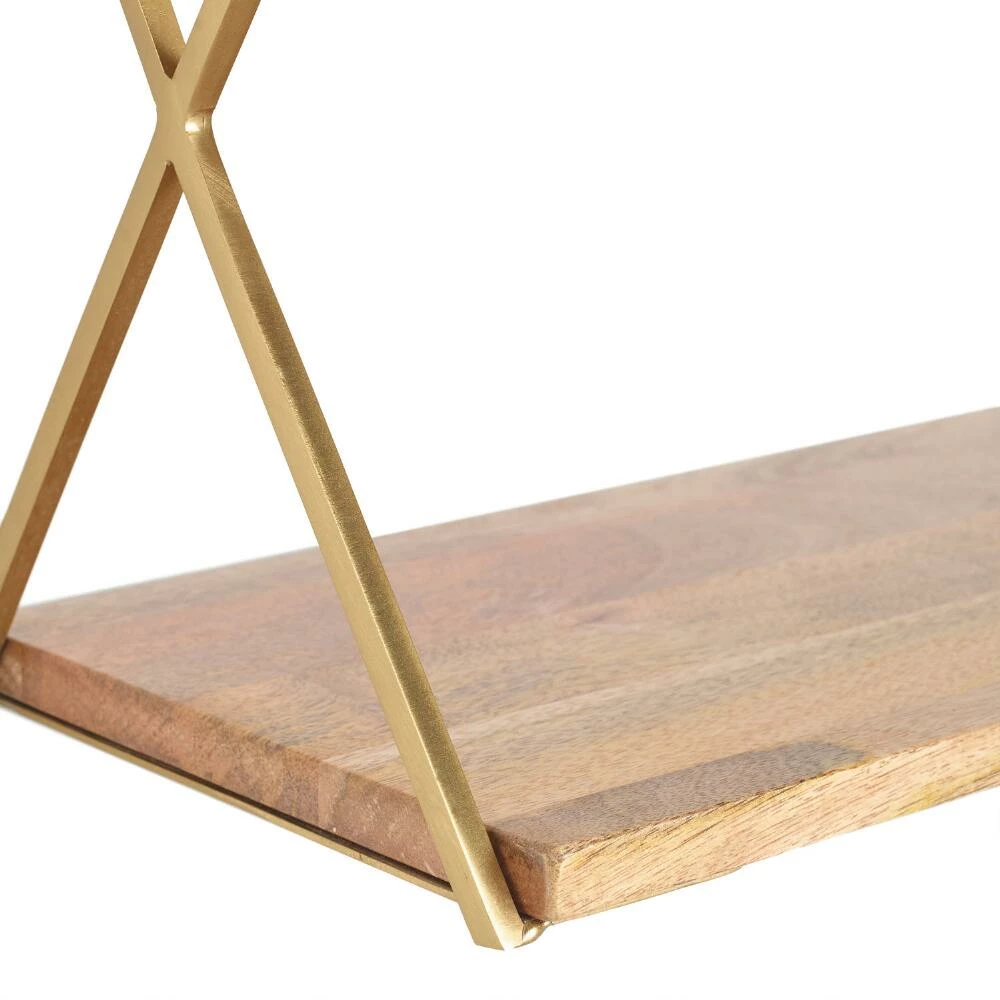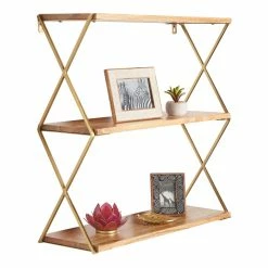 Constructed with gold metal crisscross designs affixed to smooth wood shelves in a natural finish, this tiered wall shelf is both functional and fabulous. Hang it on the wall anywhere that calls for displaying travel mementos, small succulents or framed memories.