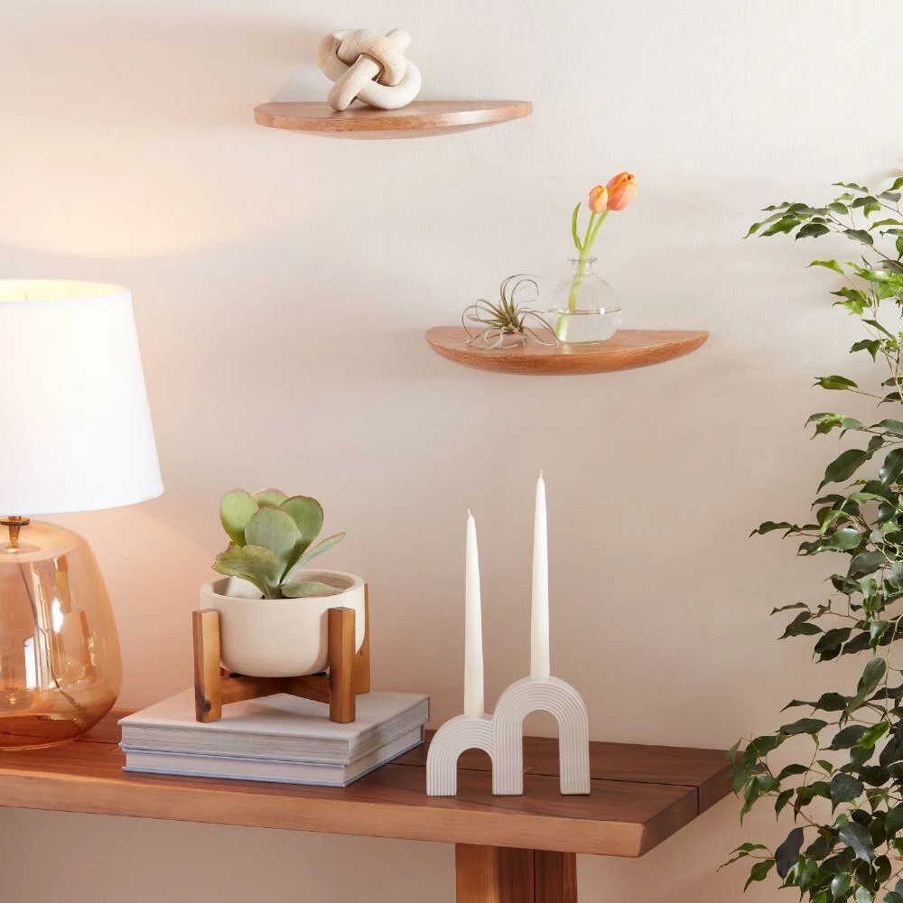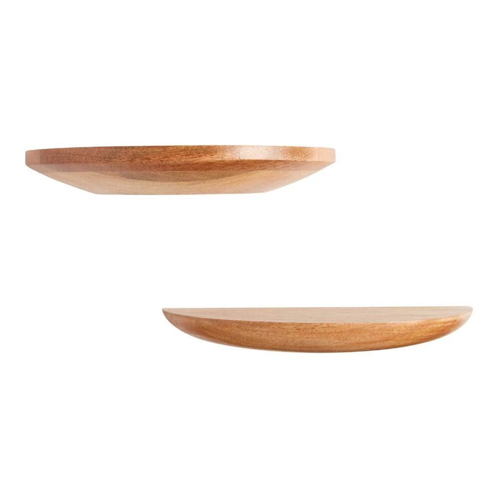 Create a space that’s unique to you with our exclusive set of two half-circle wall shelves. Crafted of warm wood with slight variations in the natural grain, each rounded floating shelf makes the perfect setting to display collected objects, cherished photos and more. To instantly update your space simply switch out the decor for a fresh feel all year long.