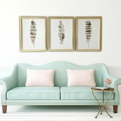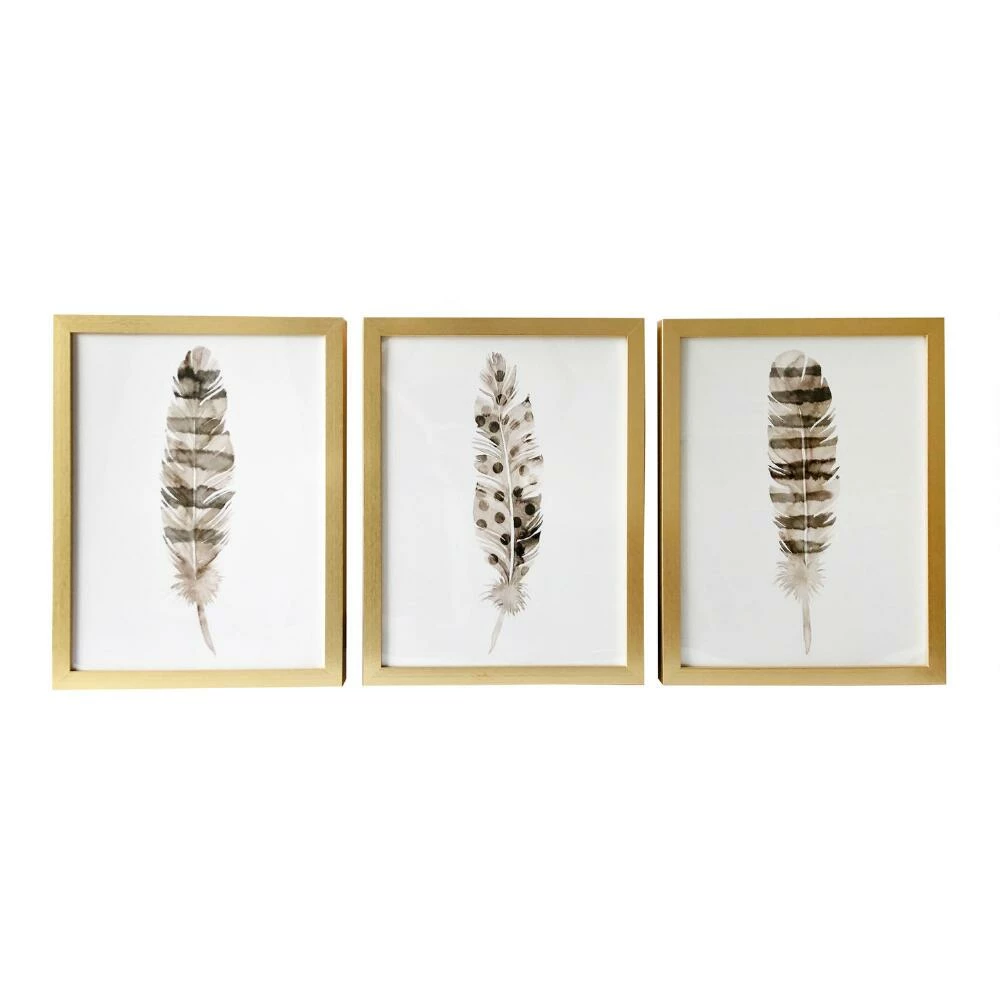 This collection of three feather wall art prints delivers the perfect balance of modern simplicity and nature-inspired bohemian flair to any room. Each lifelike, neutral feather features stripes or organic dots and is set on a crisp white ground. Complete with luxe gold frames, display this wall decor set around your space or in a row to make an elevated statement.