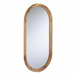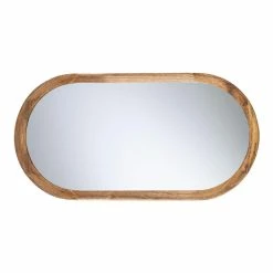 This wall mirror features a unique oblong shape that calls to mind mid-century design but with a decidedly modern edge. Crafted in India with a thick mango wood frame, it brings a warm element of the outdoors into the home while also bouncing light beautifully around any room.