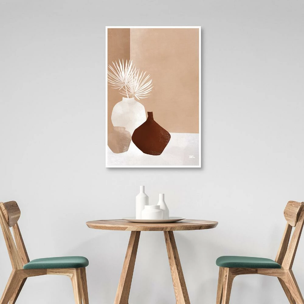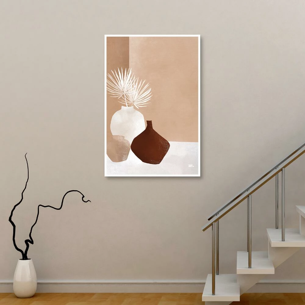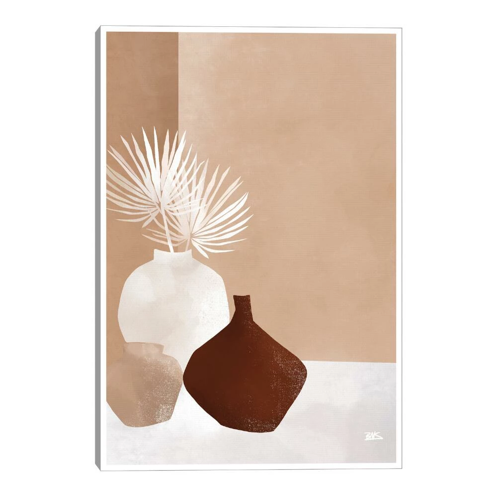 This calming and understated still life wall art features a trio of vases and palmetto leaves in neutral beige, brown and white colors with a coordinating hand-stained white plastic frame. Drawing inspiration from life’s simple joys, photography and the world around her, artist Bria Nicole creates boho-inflected works of art that give instant life to any blank wall.