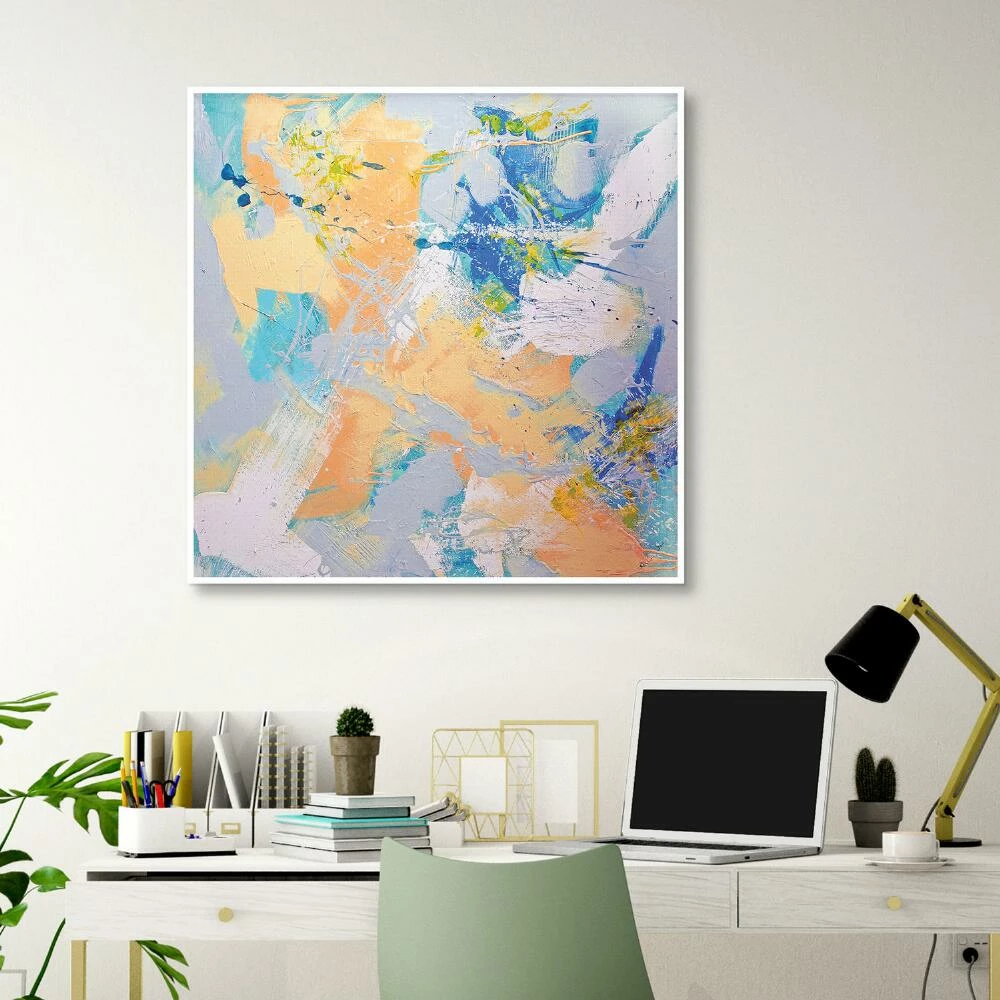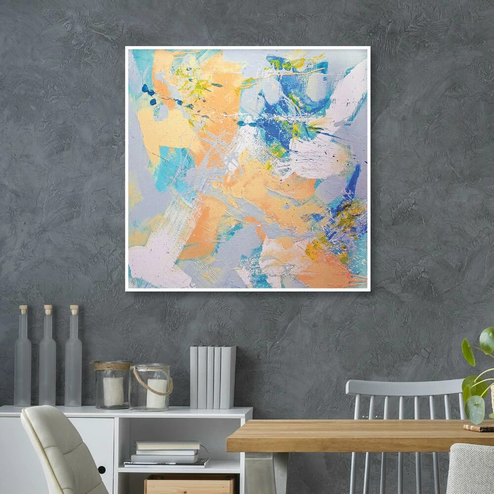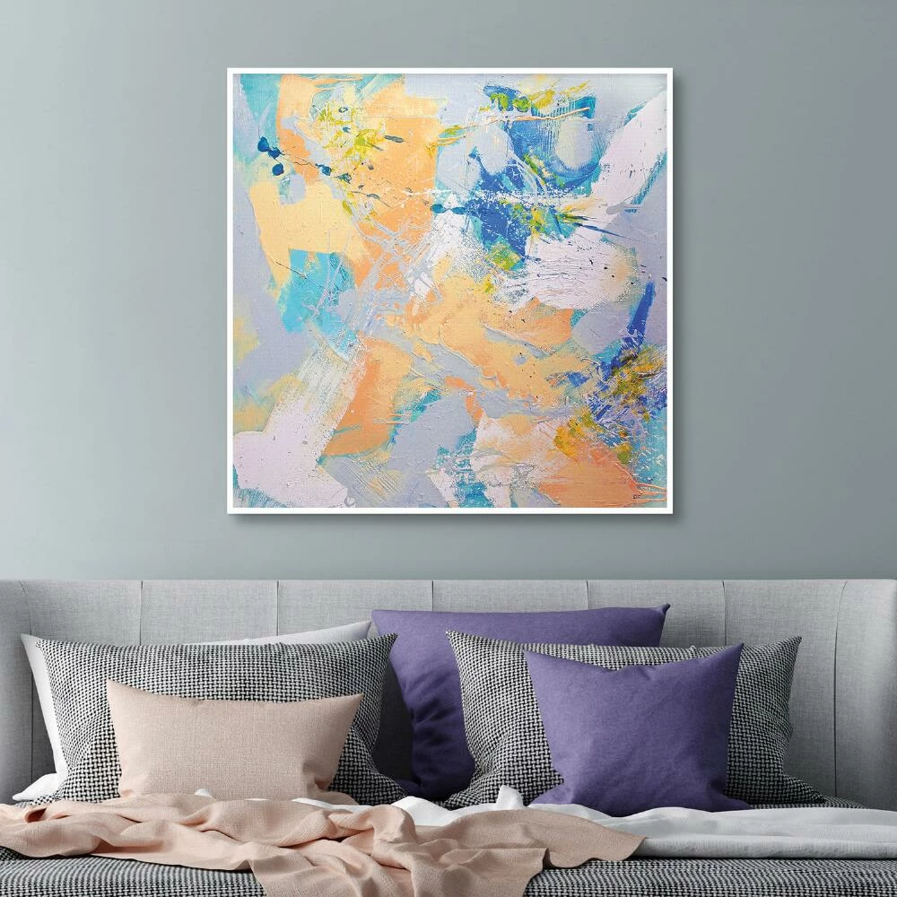 Lush brushstrokes and a dreamy pastel color palette give this textured wall art its peaceful, powerful beauty. Inspired by nature, romance and jazz, artist Dan Houston is known for contemporary abstract pieces marked by fearless color choices and deep feeling. Framed in saturated white wood, this square canvas brings a tranquil touch to any living space.
