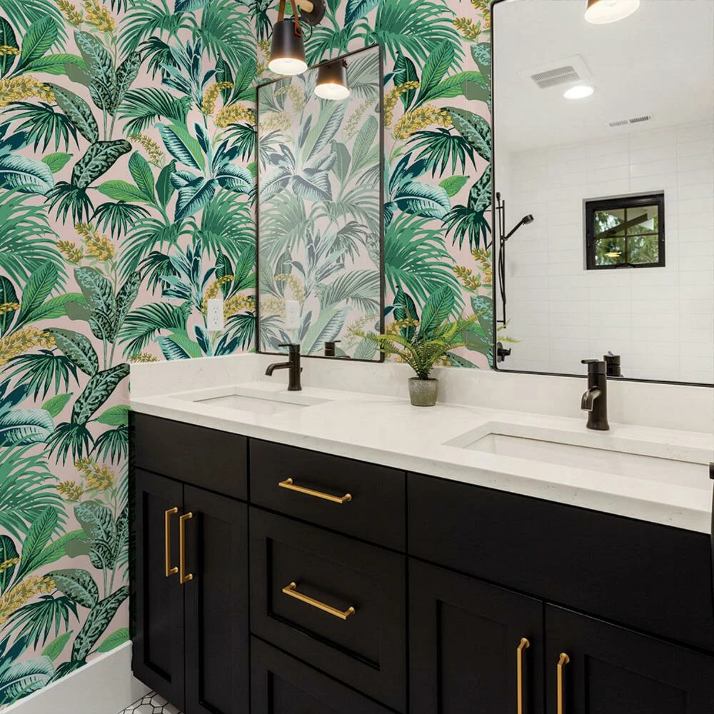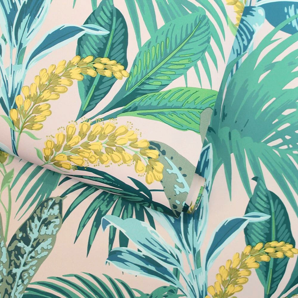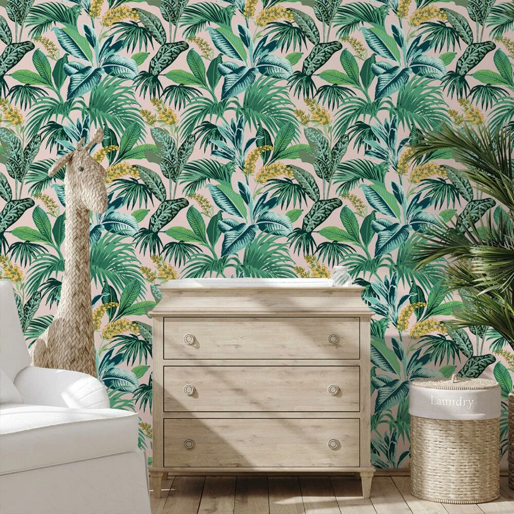 Inspired by tropical palms, this easy peel-and-stick wallpaper is sure to brighten any room with its flourishing green, blue and yellow foliage and light pink ground. Simply peel off the backing, stick your new wallpaper to a smooth surface and readjust until it’s exactly where you want it. With a strong, self-adhesive design that won’t leave a sticky residue, it’s an effortless way to transform any wall, cabinet interior or piece of furniture.