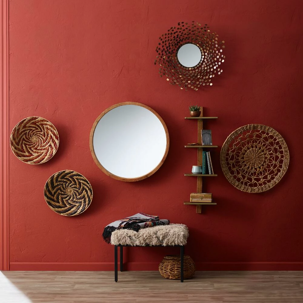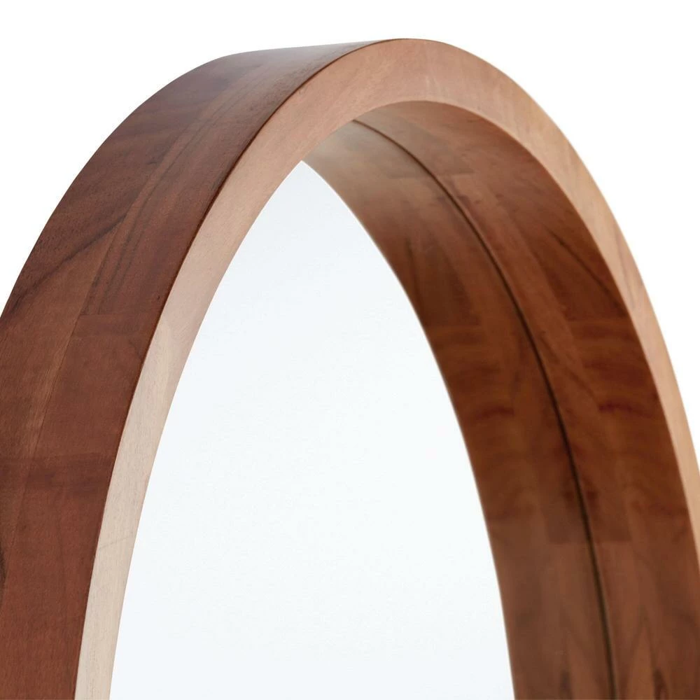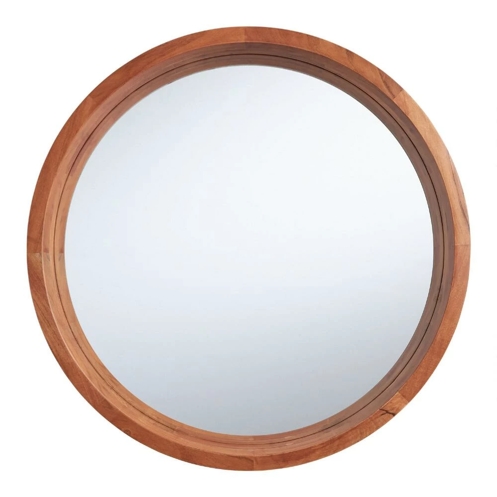 A natural finish highlights the rich acacia wood grain forming the dimensional frame of this sizeable round wall mirror. Brimming with style, this mid-century-modern mirror is a brilliant way to bring light and style into your bedroom, living room or entryway.