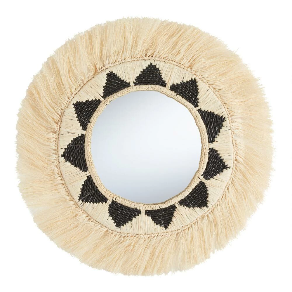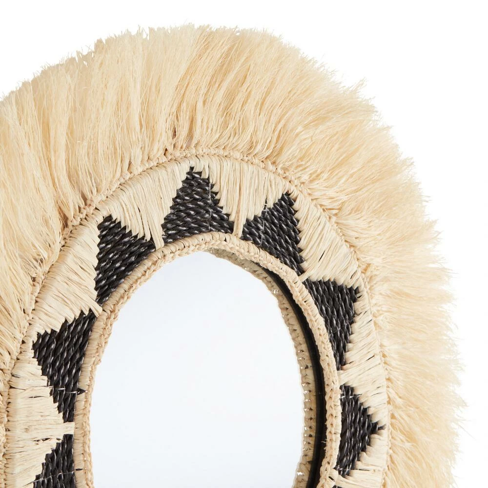 Full of textural detail, our exclusive round mirror exudes an elevated bohemian air with its wide, fringed profile and tonal geometric pattern. Handcrafted by local artisans on the southern coast of the island of Java, Indonesia, this lightweight wall mirror is made from sisal leaves which are shaved, soaked and dried in direct sunlight before being woven with raffia. The result is a one-of-a-kind work of art with an organic feel.