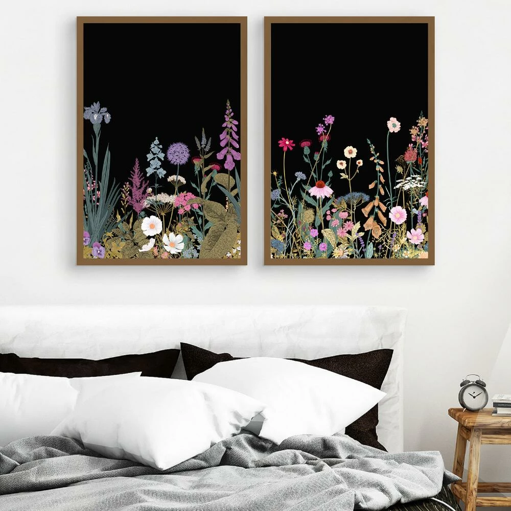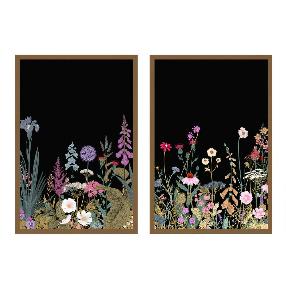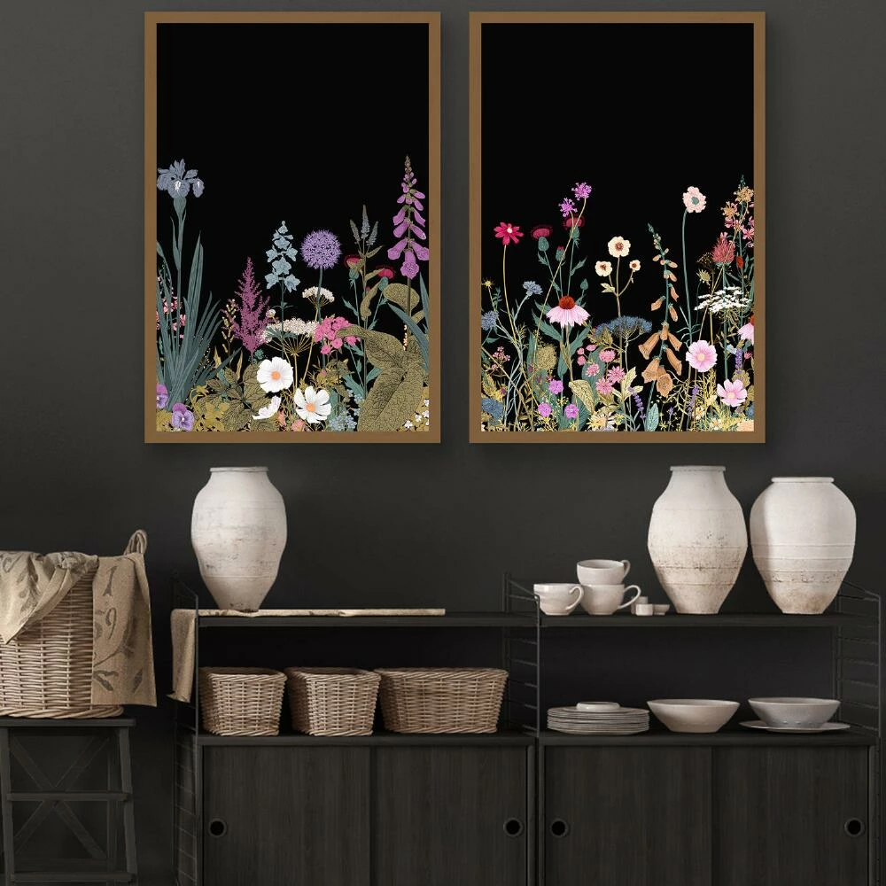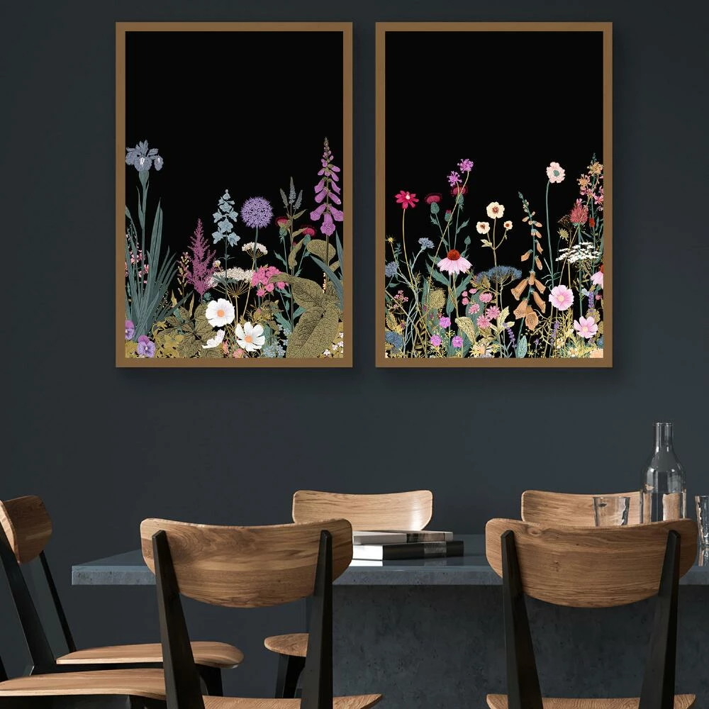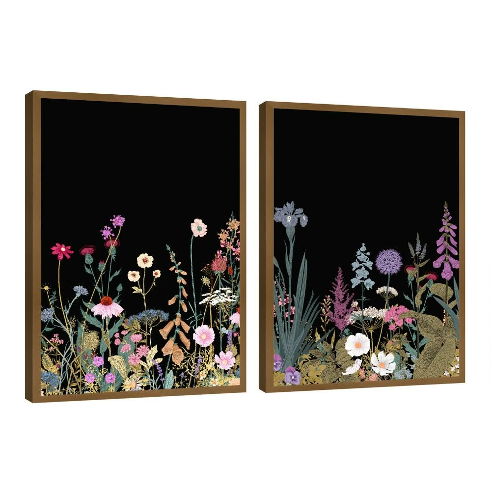 Add a pop of color and a hint of drama to your wall with these mesmerizing wildflowers printed on canvas with a black background. Framed in wood with matte-gold finish, these unique pieces are ready to hang and lend exquisite style to any space.