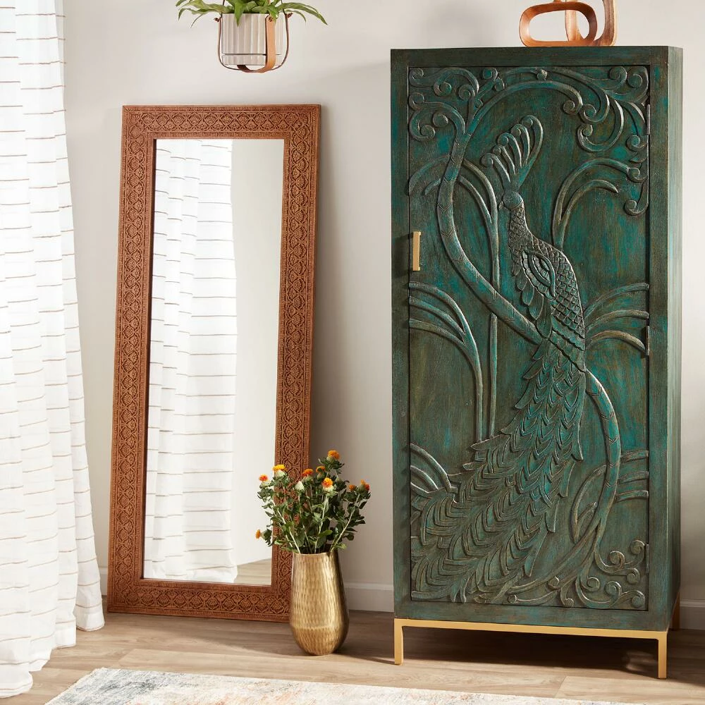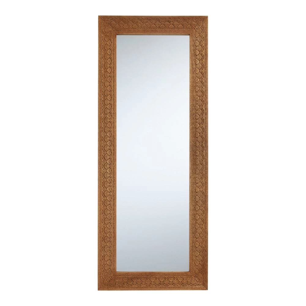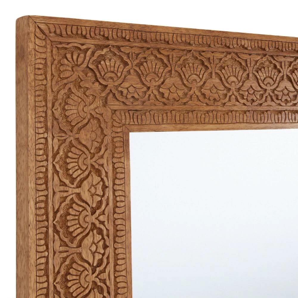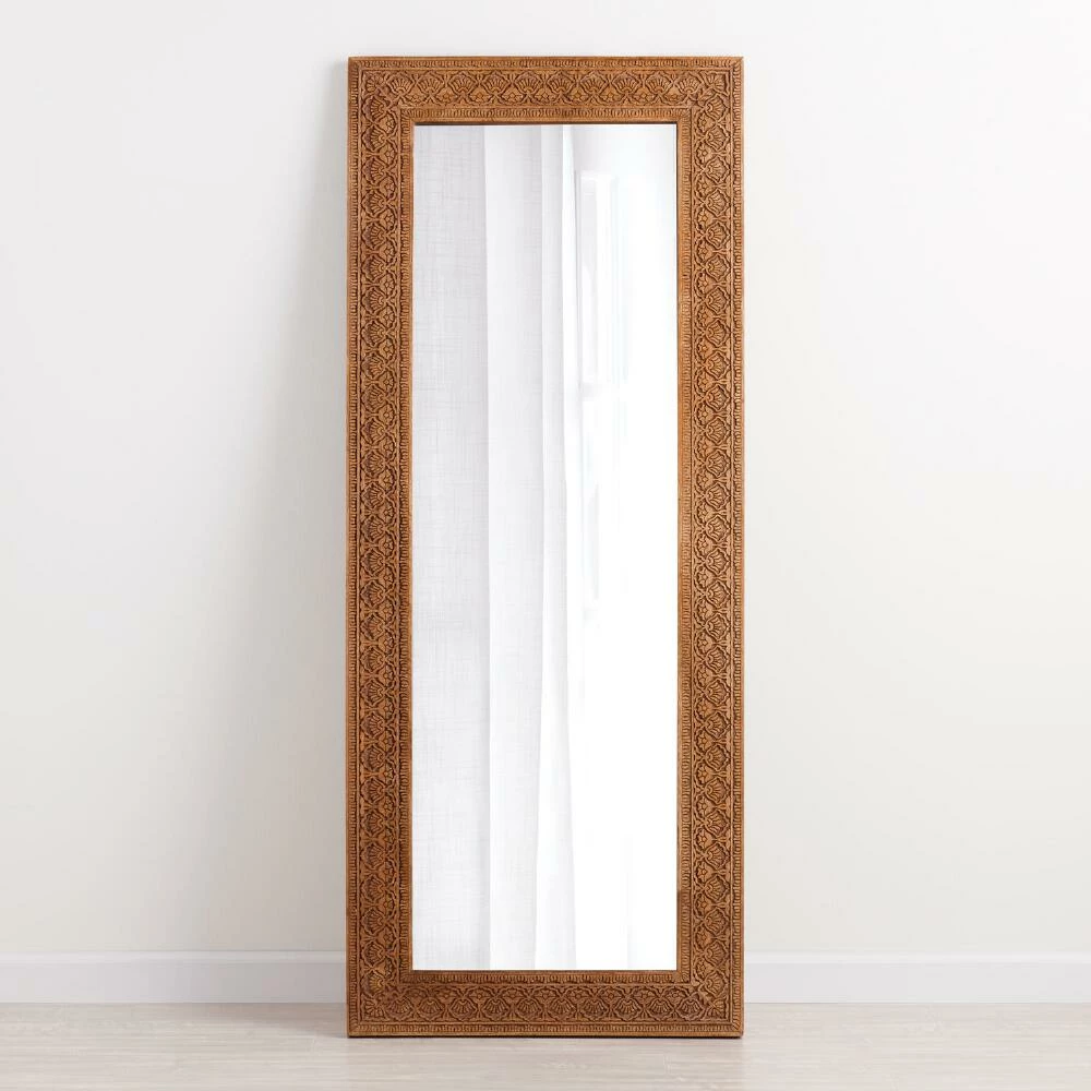 An intricately hand-carved floral motif gives our exclusive floor mirror its standout appeal. Inspired by the ornate carvings of the Taj Mahal, this leaning mirror is made by up to three different craftspeople in Saharanpur, India who outline, scoop, carve and add a natural finish to the mango wood. This increasingly rare craft takes years to learn and is only preserved by the passing down of knowledge through generations of family artisans.