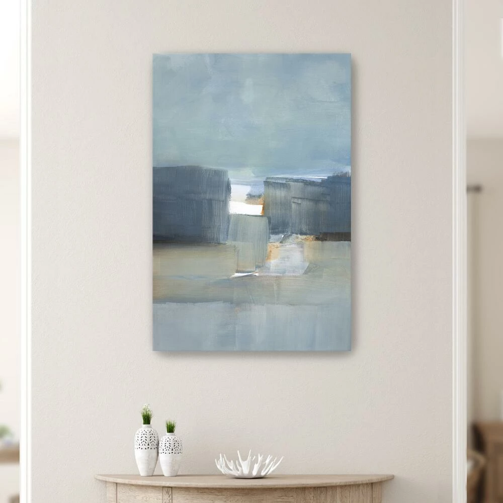 Chunky abstract brush strokes in soothing blue and gray are accented with hints of warm yellow in this striking canvas wall art. Its neutral color palette makes this abstract wall decor a versatile addition to contemporary and modern spaces.
