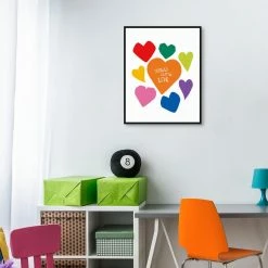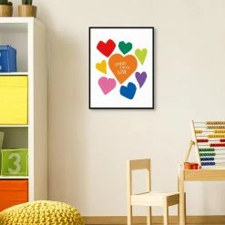 Invite inspiration into your decor with this compelling wall art piece. Displaying hearts in a rainbow of cheerful tones, the phrase “Spread a little love” and a black-finished wood frame, this premium canvas print encourages all who see it to take on the day with a contagious positivity that uplifts others.