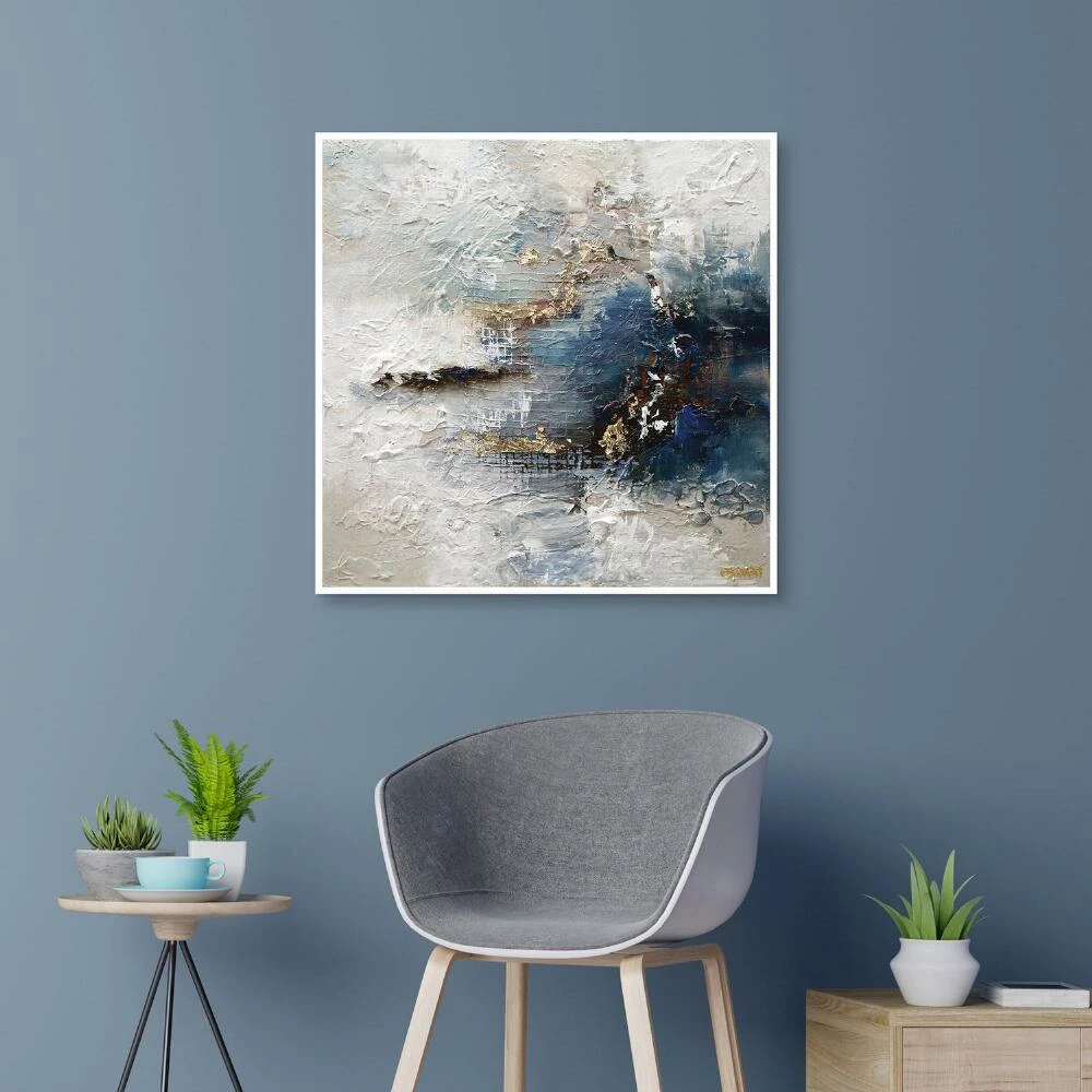 This abstract canvas print brings movement and dimension to your interior with flowing shades of blue, teal and gold. Blending abstract landscapes and modern techniques, Israeli artist Osnat Tzadok began their career in painting over 20 years ago and has showcased their work around the world. This wall art comes ready to hang in a white frame.