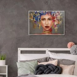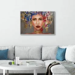 With imaginative accents in blue, pink and gold hues, this vibrant canvas print of a woman by Israeli artist Osnat Tzadok is sure to capture attention. Blending abstract landscapes and modern techniques, Tzadok began their career in painting over 20 years ago and has showcased their work around the world. This wall art comes ready to hang in a champagne-silver frame.