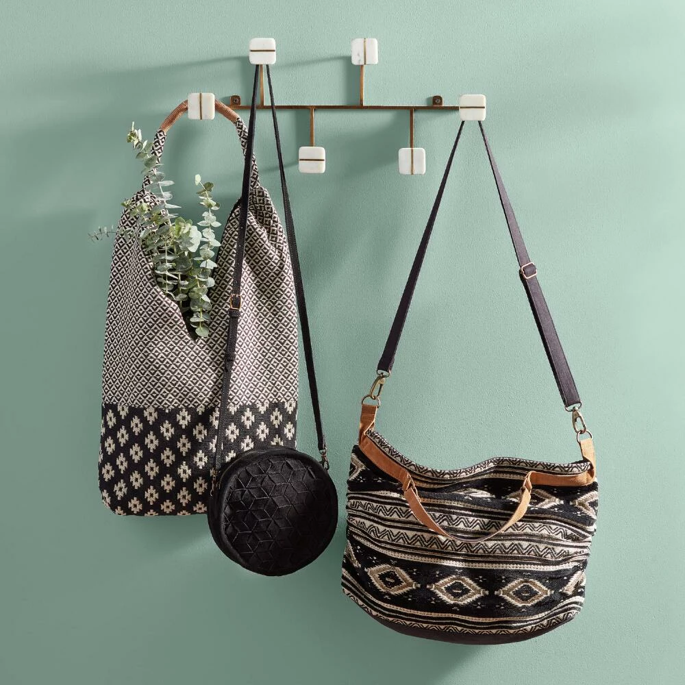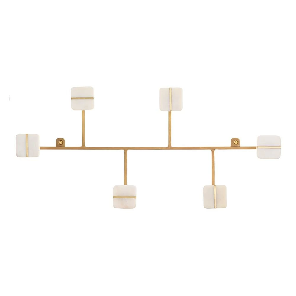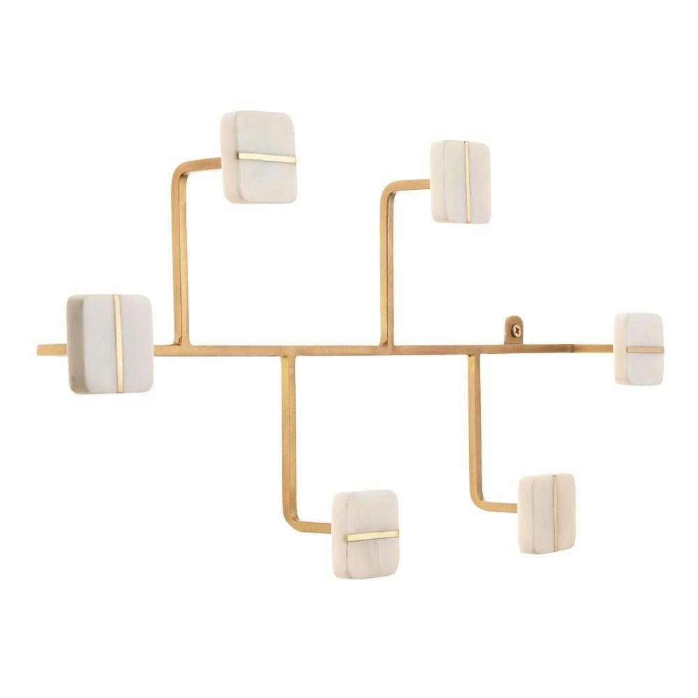 Featuring six square white-marble hooks with gold-metal inlay and a luxe gold bar, our asymmetrical wall rack is effortlessly refined. Sleek, easy to install and space saving, this exclusive decor piece is an on-trend accent that doubles as much-needed storage.