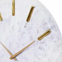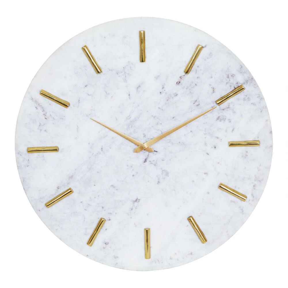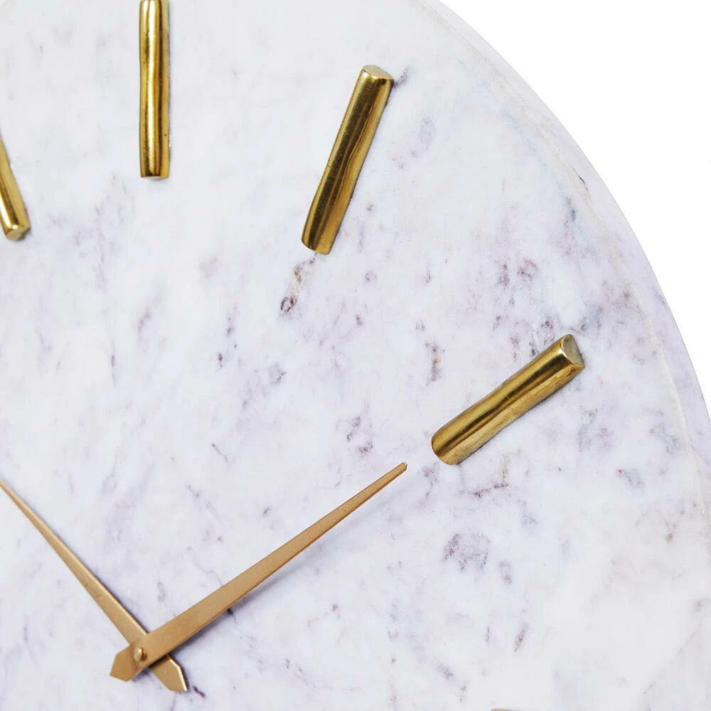 Exuding a modern elegance, this minimalist wall clock features a white marble face with gold hands and hour lines. Color and pattern variations are inherent in natural marble, ensuring that each piece is one of a kind with markings unique only to it.