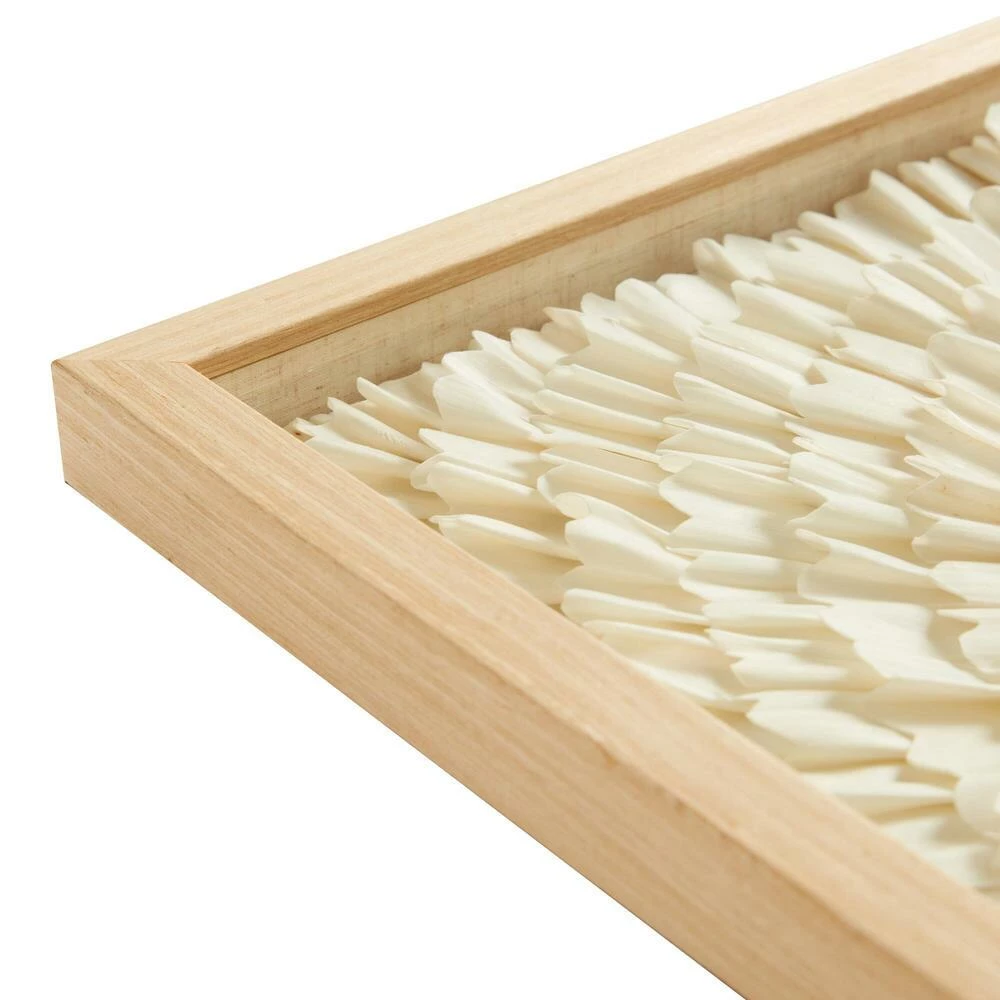 Our exclusive, texture-rich wall art is meant to be a marvel. Thick petals of white and natural-toned paper are skillfully hand-shaped and layered one by one into a concentric floral design. Set under glass and finished with a shadowbox frame, this neutral artwork has subtle, natural variations that makes each piece unique from the next.